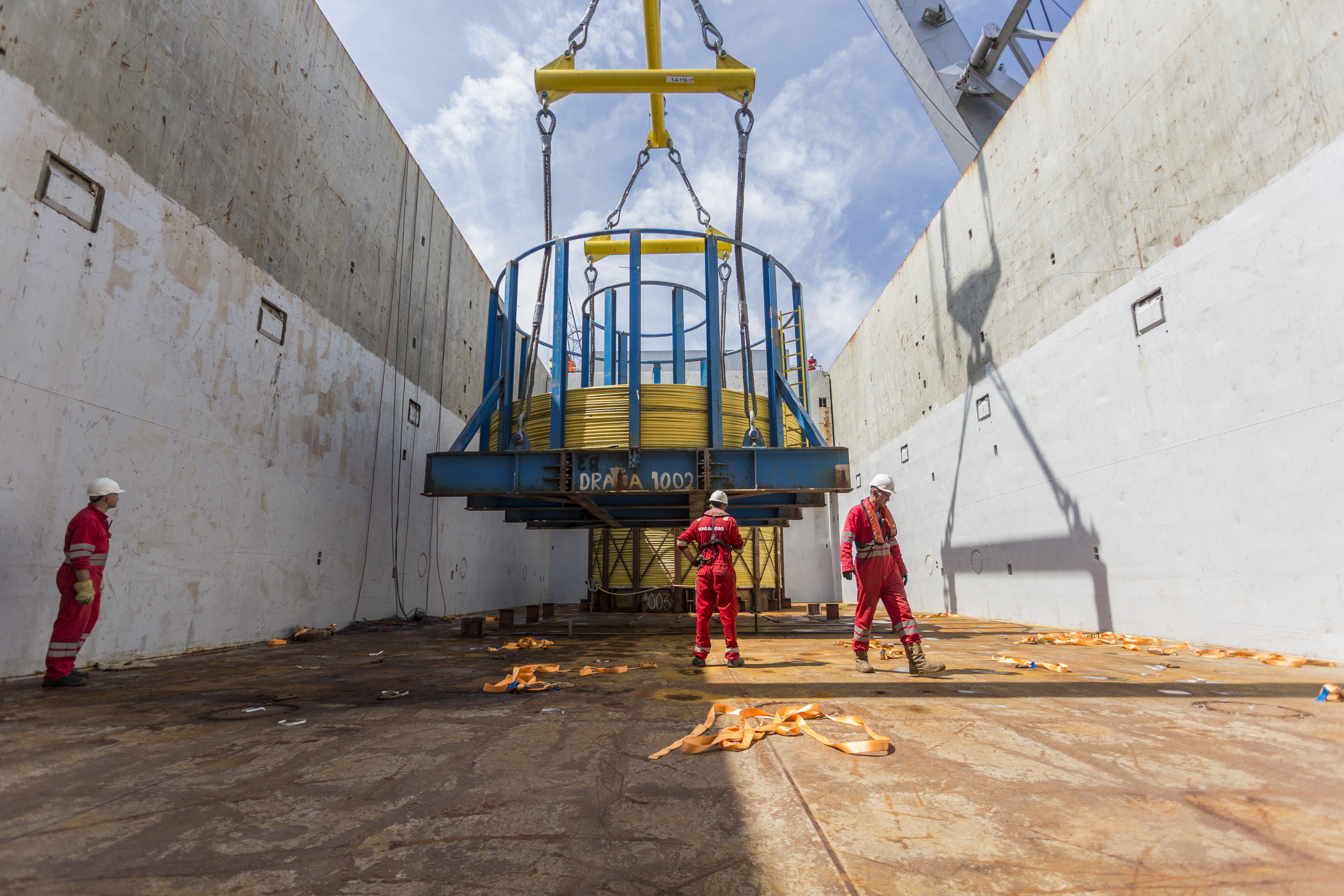 First contact between Wagenborg and Prysmian was established through in 2015. The m.v. Albanyborg was booked to ship the DolWin3 cable from the production facility in Pikkala to Emden. For this shipment cargo superintendent Albert Sneijders developed a special cable tank: “The hold was fitted with pillars and stanchions, positioned as an inner- and outer ring to serve as a cable tank. As much as it was functional, the construction left room for improvement. Installing the cable tank took very long and the construction could only be used once”, Albert explains. In addition, the Albanyborg was also fitted with special equipment on deck in order to be able to use the deck cranes to handle the 34 m long HVDC cable. Wagenborg’s performance satisfied Prysmian to such a degree that a follow up meeting was scheduled immediately in order to continue the business. Albert continues: “We suggested developing a reusable and transportable cable tank. We opted for a Meccano-like structure: it could be placed in the hold quickly, with minimal welding and would be able to make use of the moveable bulkheads and hold partitions already on board”. To full satisfaction, Wagenborg carried out several trips in 2015 for DolWin3 and the Canakkale II Project in Dardanelles Straight - Turkey using this tank construction in the m.v. Amstelborg. “One of these trips required the tanks to be adapted to a bigger coiling radius”, Albert recounts. “In order to increase the inner diameter of the cable tank we created a special adapter consisting of several boltable pillars secured by mooring chains on the inside of the existing construction”.