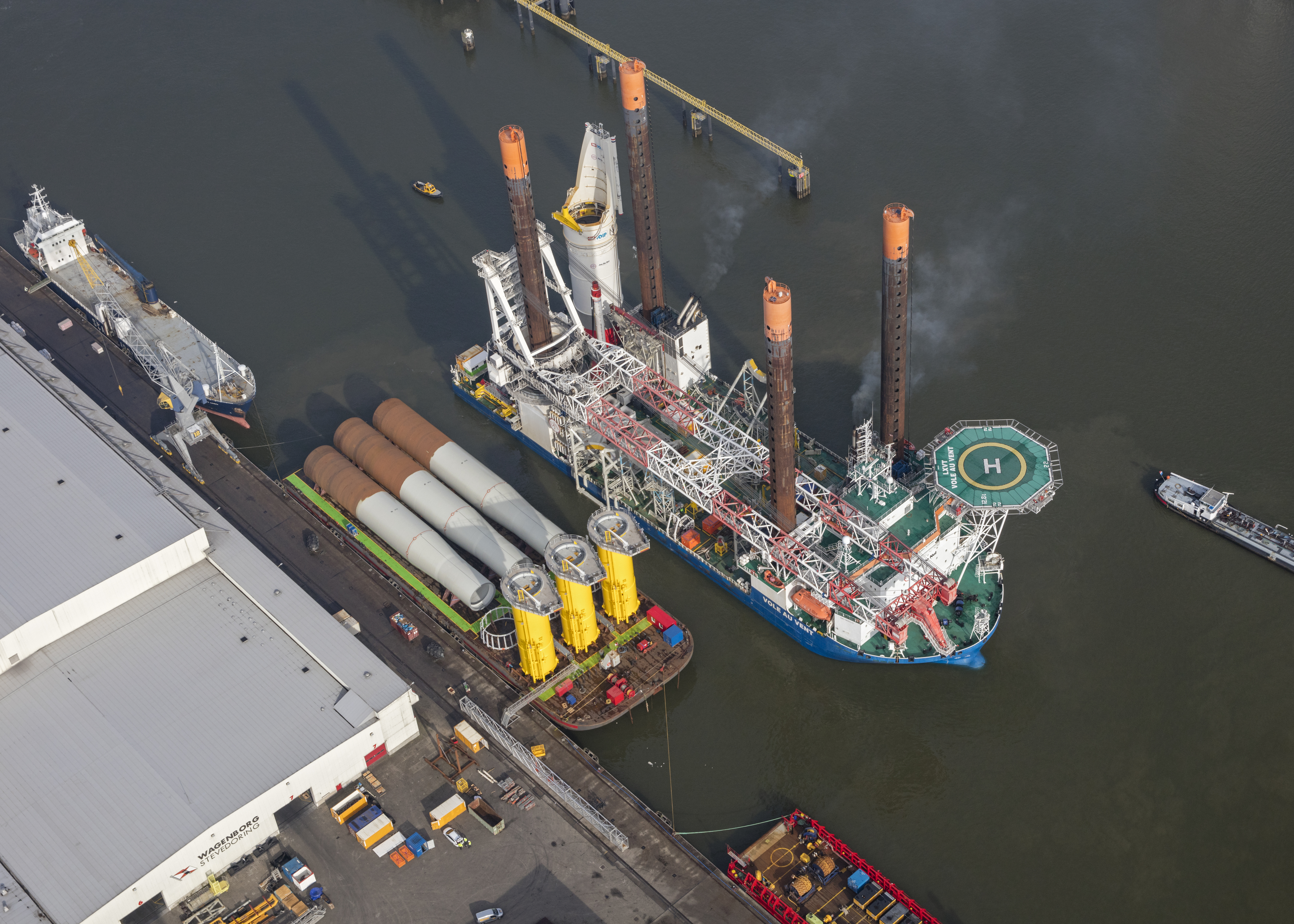 In 2016, the Danish company DONG Energy, now Ørsted, decided to build the Borkum Riffgrund 2 offshore wind farm in German territorial waters. Ørsted commissioned the Jan de Nul Group to transport and install 36 monopiles and transition pieces. Those components were constructed by Steelwind Nordenham. To transport all the components, Jan de Nul in turn called in the aid of Wagenborg. Jan de Nul is responsible for installing the foundations with its jack-up vessel “Vole au Vent” from the Wagenborg terminal at Eemshaven.