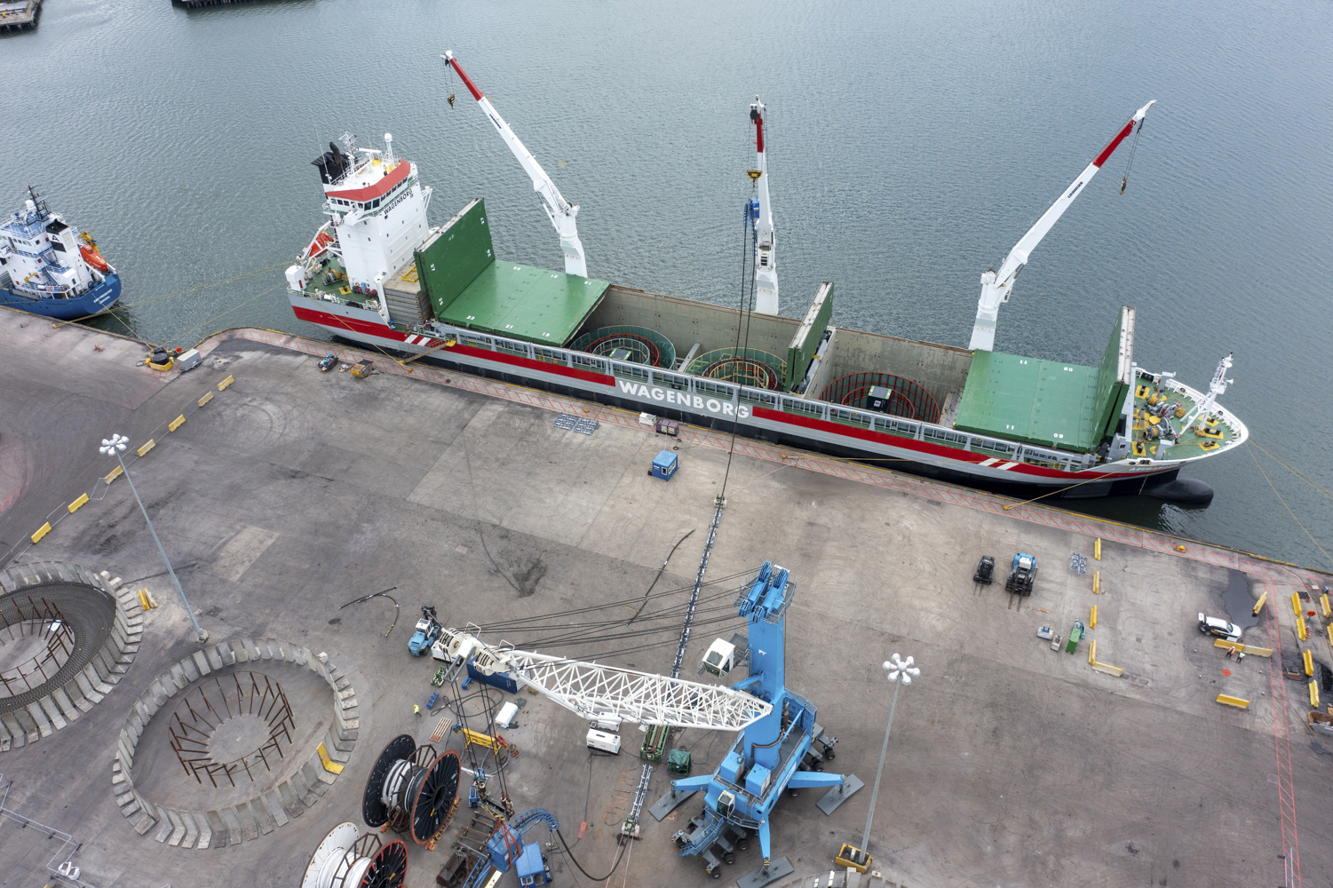 3 cranes fixed on portside - each with a capacity of 60 mts at a reach of upto 16m.