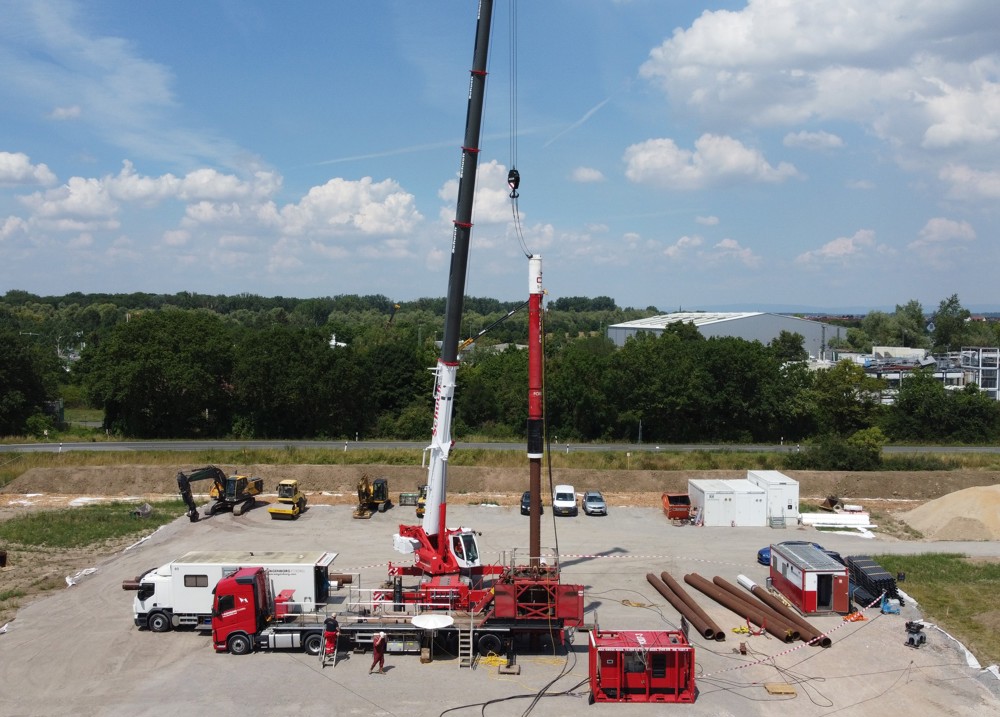 First, a quick lesson in conductor piling for beginners. The conductors are made up of tubes - in this case over 12 meters in length. A special pile-driving hammer is used to drive the tubes into the ground at right angles. When the tube is still about 2.5 meters above the ground, the Foxdrill specialists use a special piling trailer to place the next tube on top of it and weld the tubes together. Then it's the piling hammers' turn again. Depending on the geology of the subsoil, depths of 30 to 100 meters can be achieved.