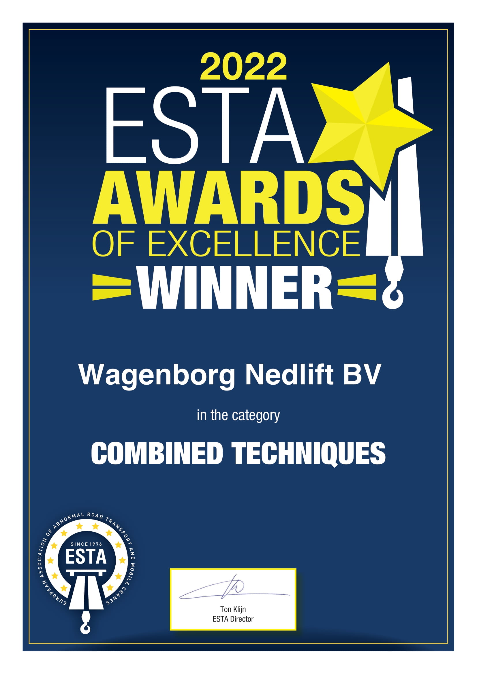 ESTA is the European Association of heavy transport, heavy lifting and crane rental companies. The ESTA represents the national associations in the heavy transport and lifting sector. Each year, ESTA Awards are awarded for extraordinary projects in the field of technical ingenuity, innovation or safety.