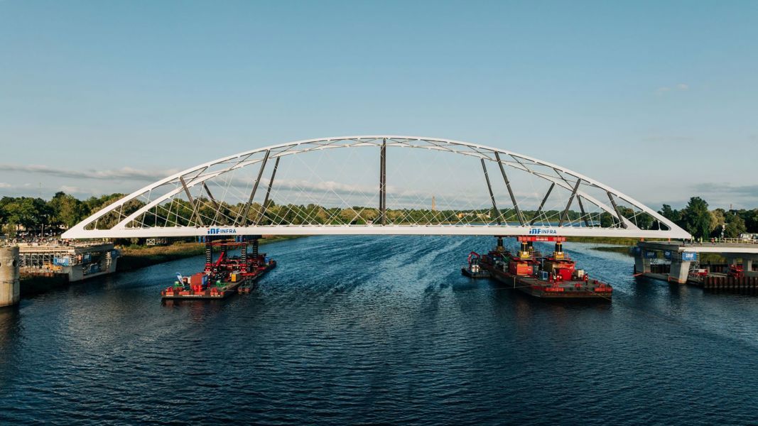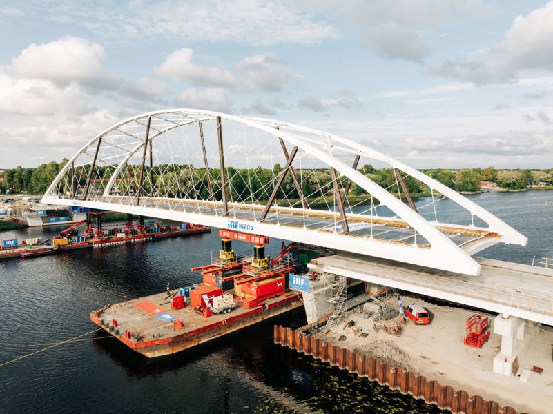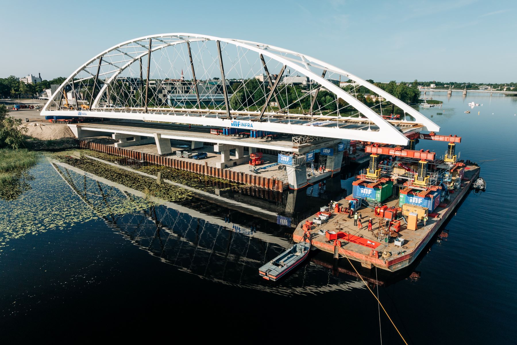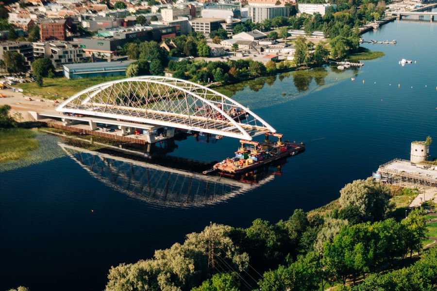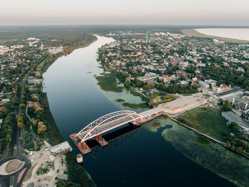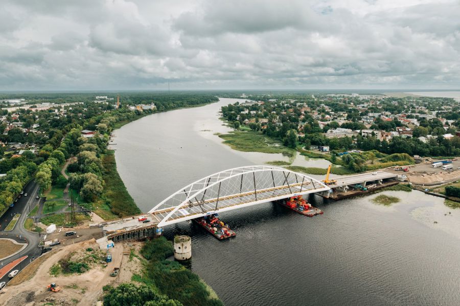 The new steel arch bridge is a colossus, weighing 950 tonnes. And with a span of no less than 140 metres, it is by far the longest bridge in Estonia. For the transport operation, the bridge has been reinforced with additional structures, bringing its total weight to almost 1,200 tonnes. The access bridge, over which the transport to the river takes place, was also reinforced for the occasion.