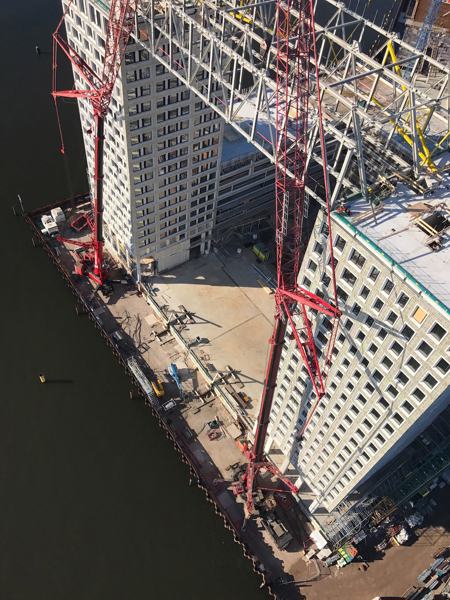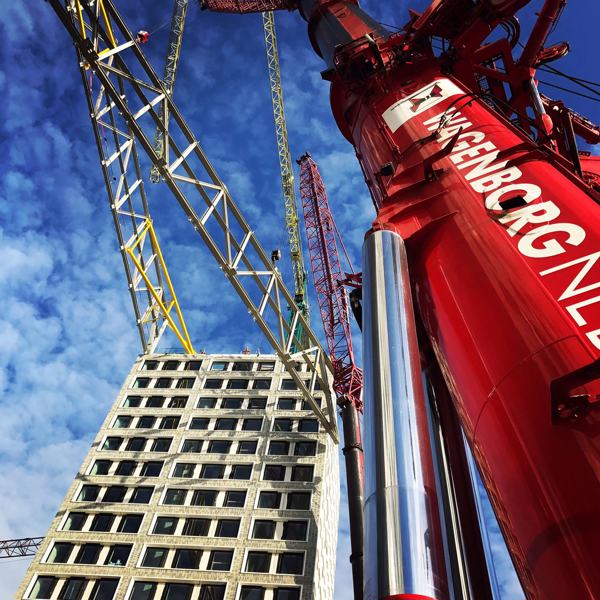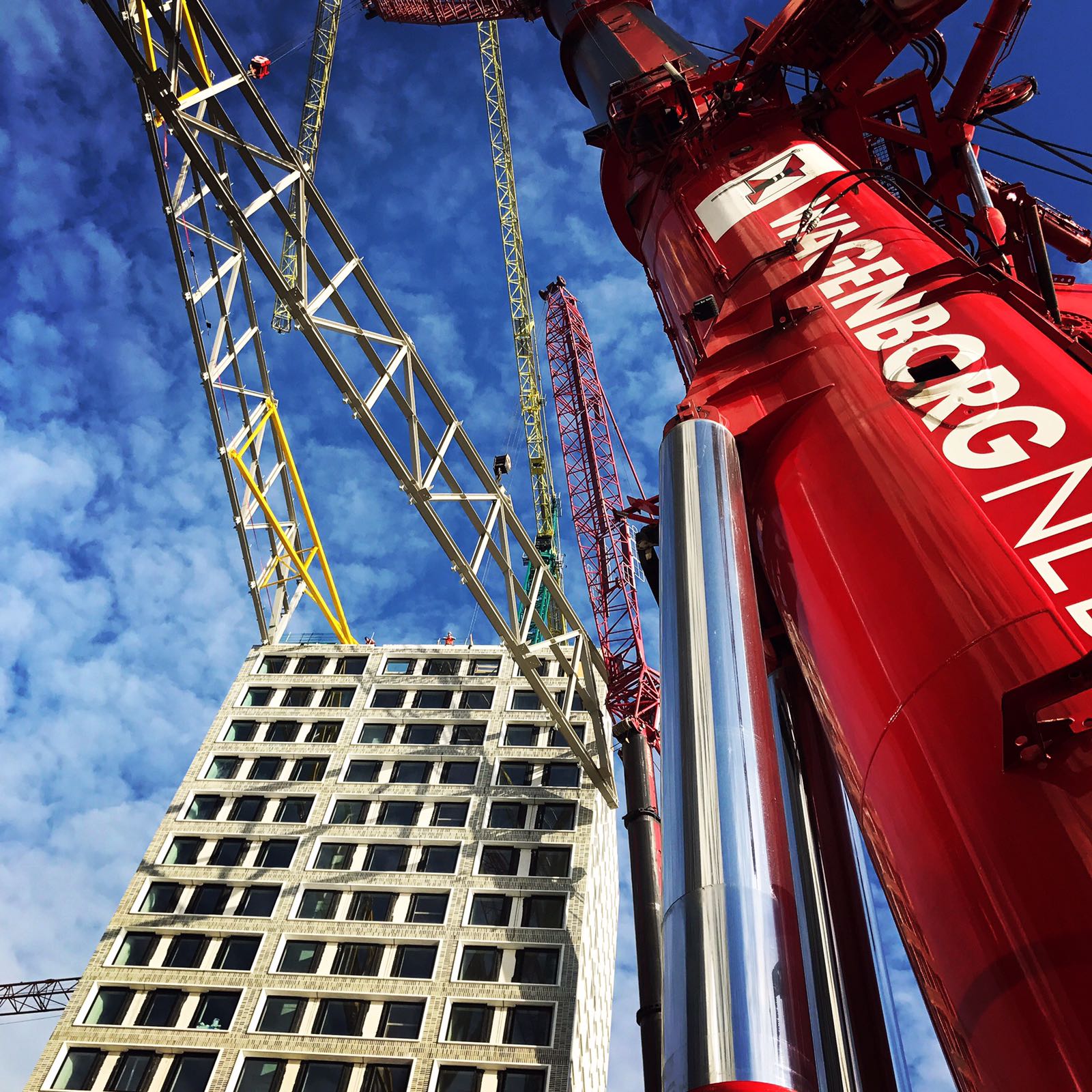 To install the trusses (with a length up to 48.5 metre and weighing up to 78 tonnes each), Wagenborg deployed two mobile telescopic cranes equipped with a jib, each with a lifting capacity of 500 tonnes. The Pontsteiger is situated on the river IJ, a beautiful but very cramped jobsite. Both cranes had to be positioned between the structure itself and the sheet piling. Not a problem for Wagenborg, but above all an interesting challenge.