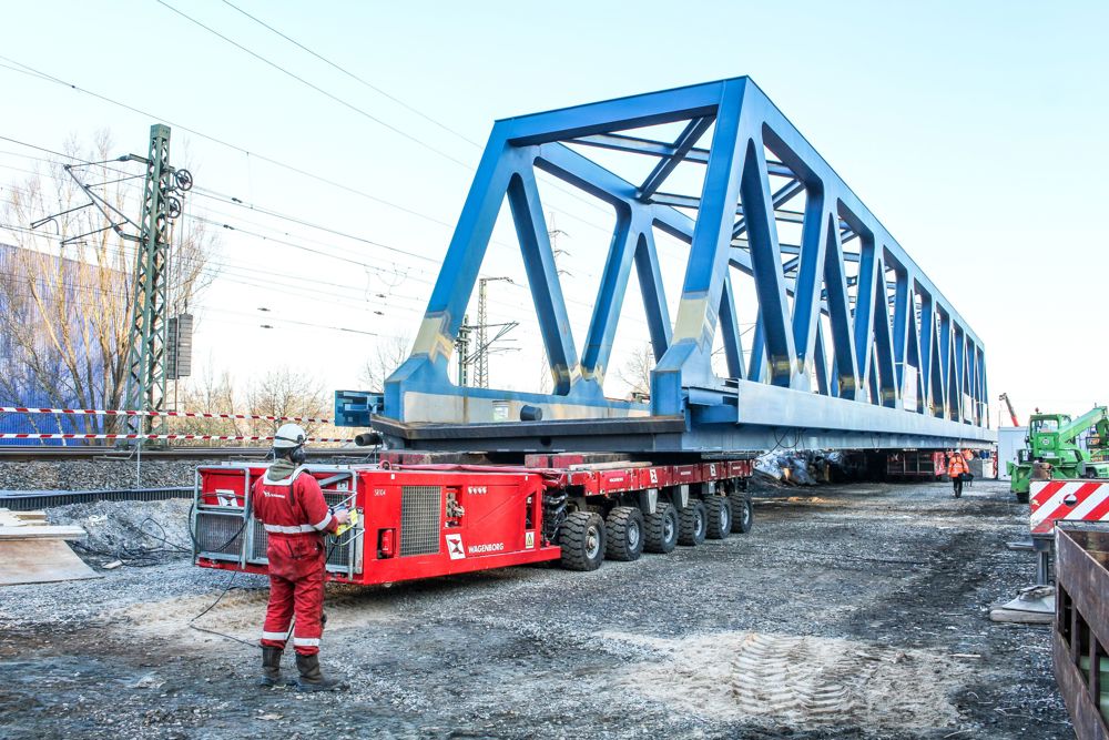The new rail bridge, a colossal structure that is more than 65 metres long and weighs over 410 tonnes, was constructed at a pre-assembly site adjacent to the canal and the existing rail bridges. Two sets of SPMTs were used to load the bridge in a single piece, then to manoeuvre it into the correct position on the abutment.