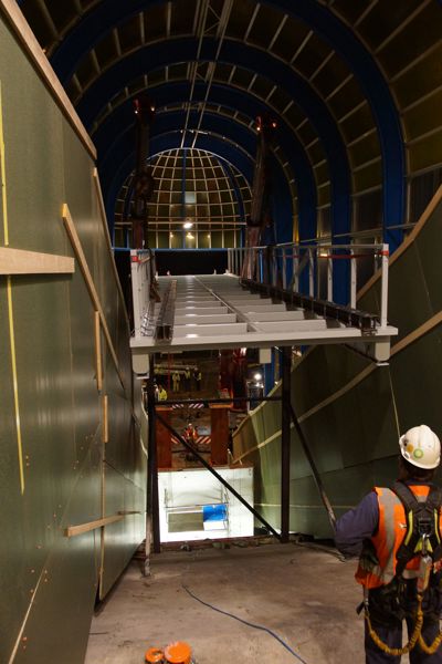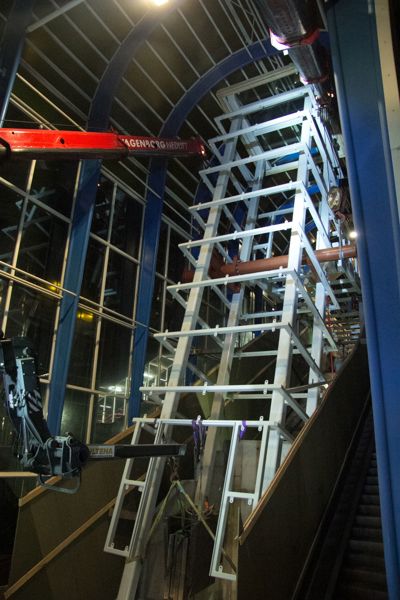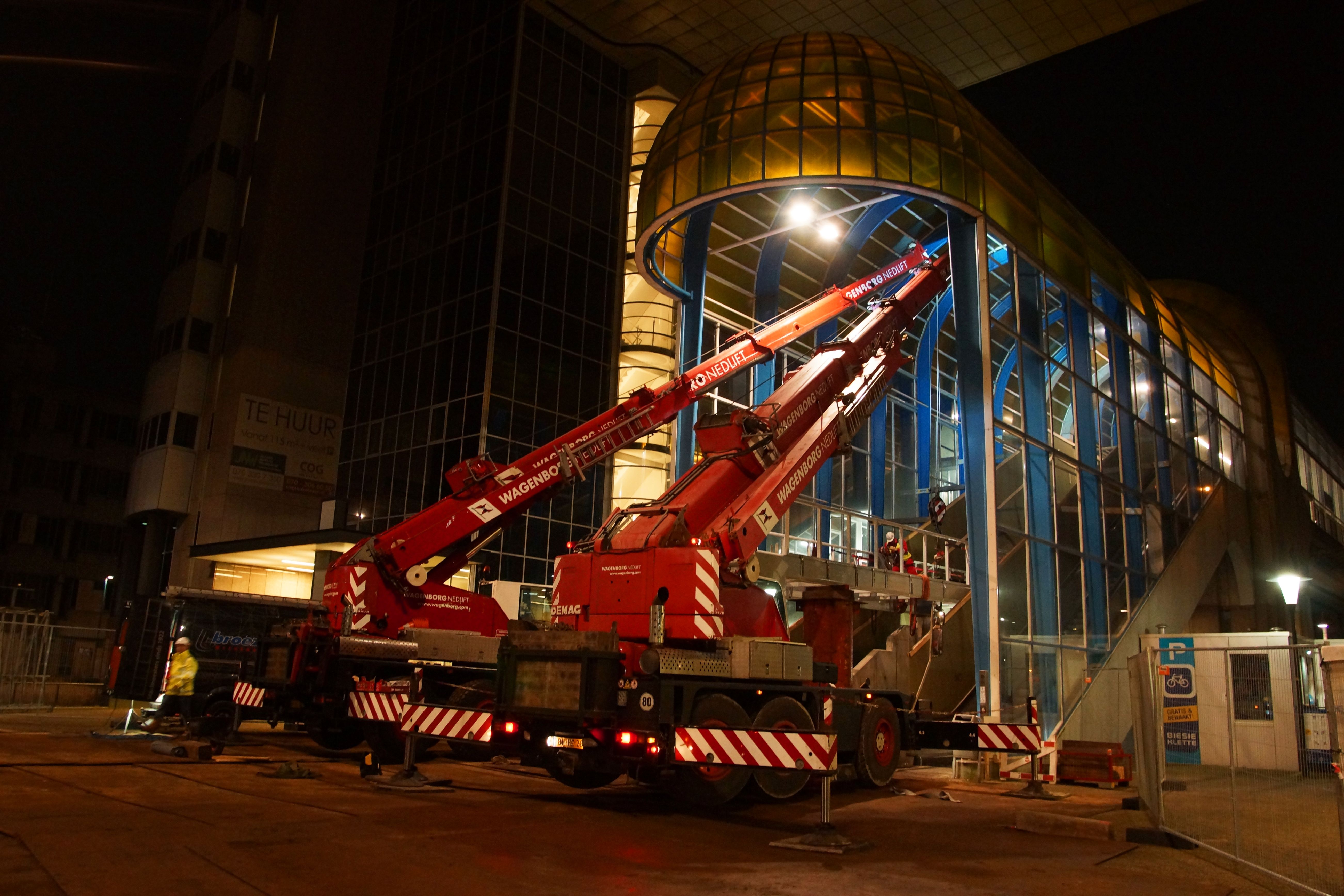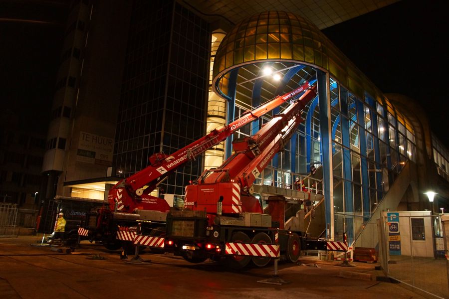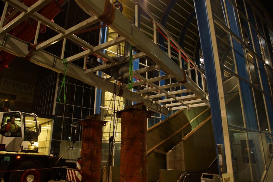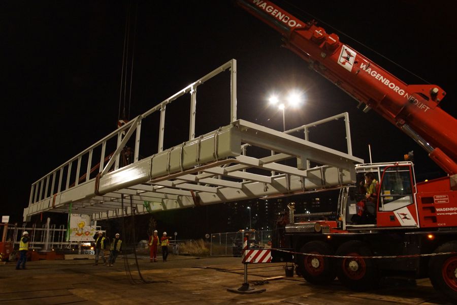 Once the lift construction had been placed, the new walkway could be hoisted against the shaft up to its final position, where the Wagenborg Nedlift team lowered the bridge using the compact cranes and jacking equipment.