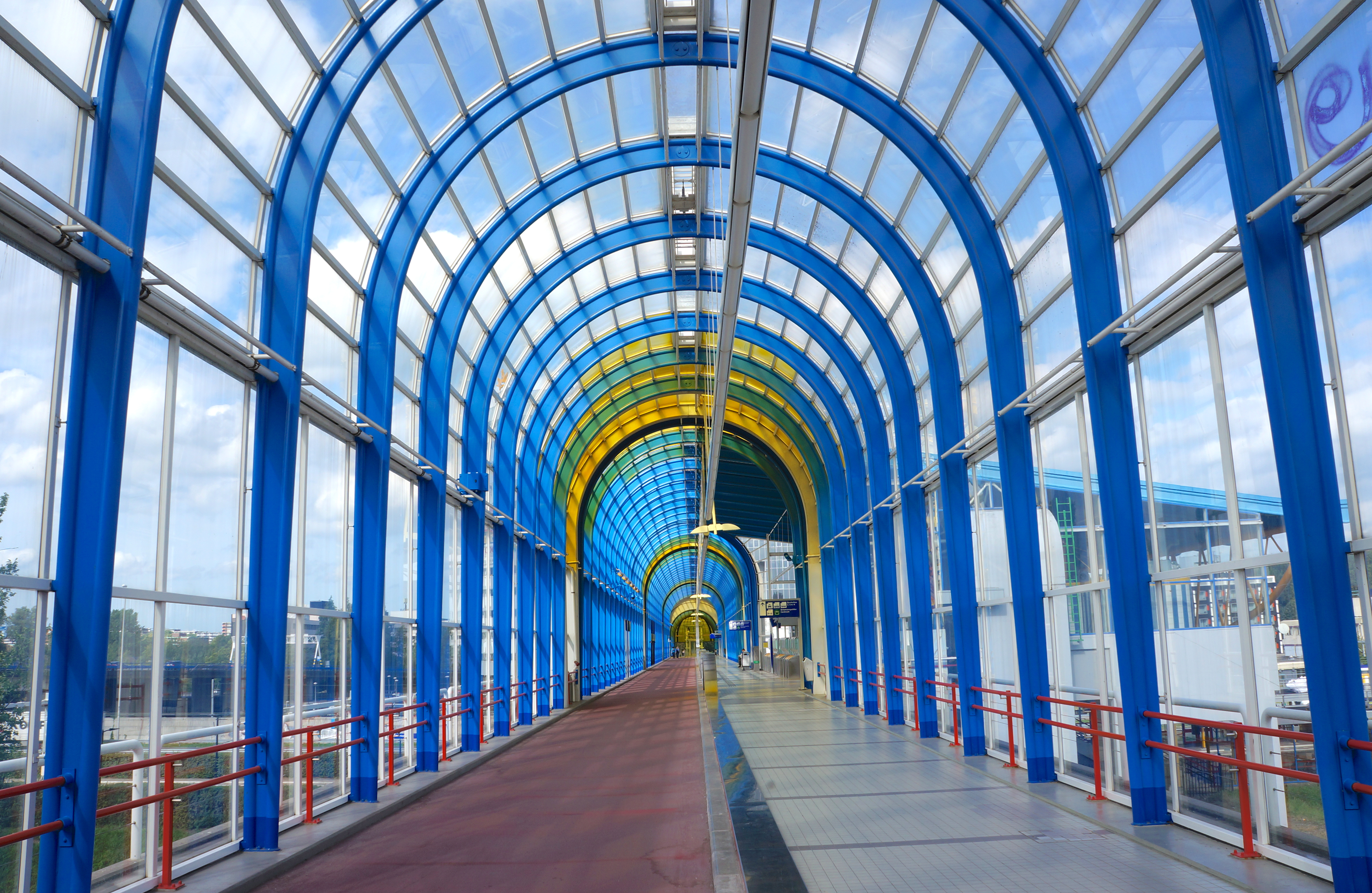 Architect Johan Bak designed a 180-metre bridge with an all-glass canopy with blue and yellow panels for this horticultural exhibition. These colours are incorporated in the municipal coat of arms of Zoetermeer.