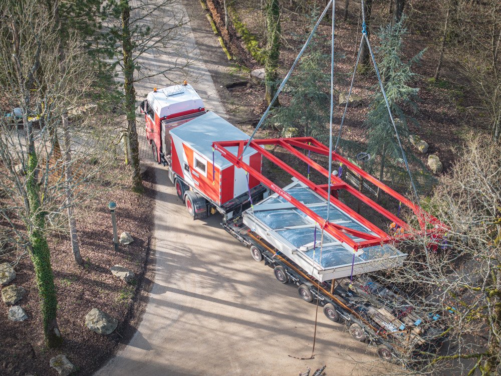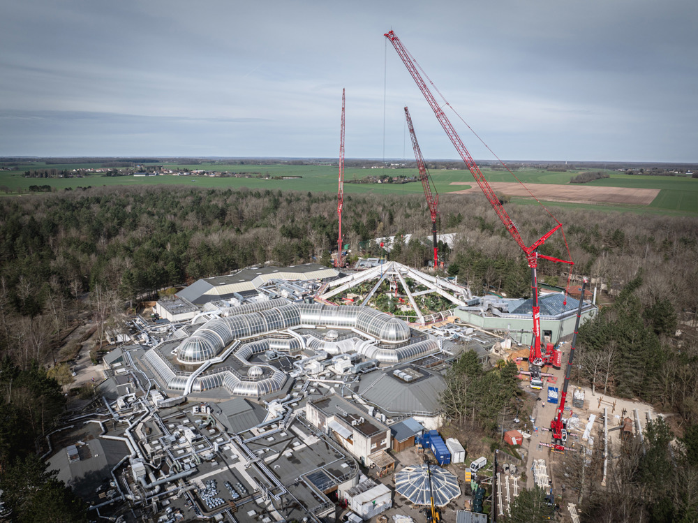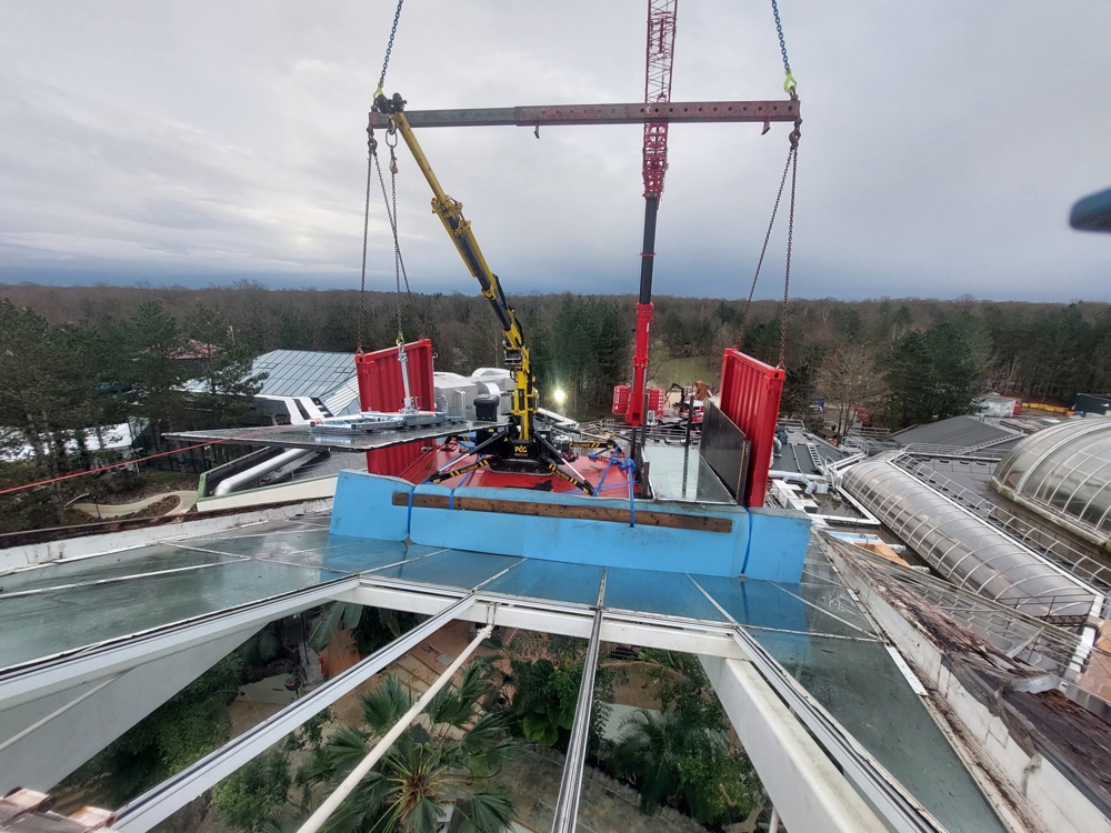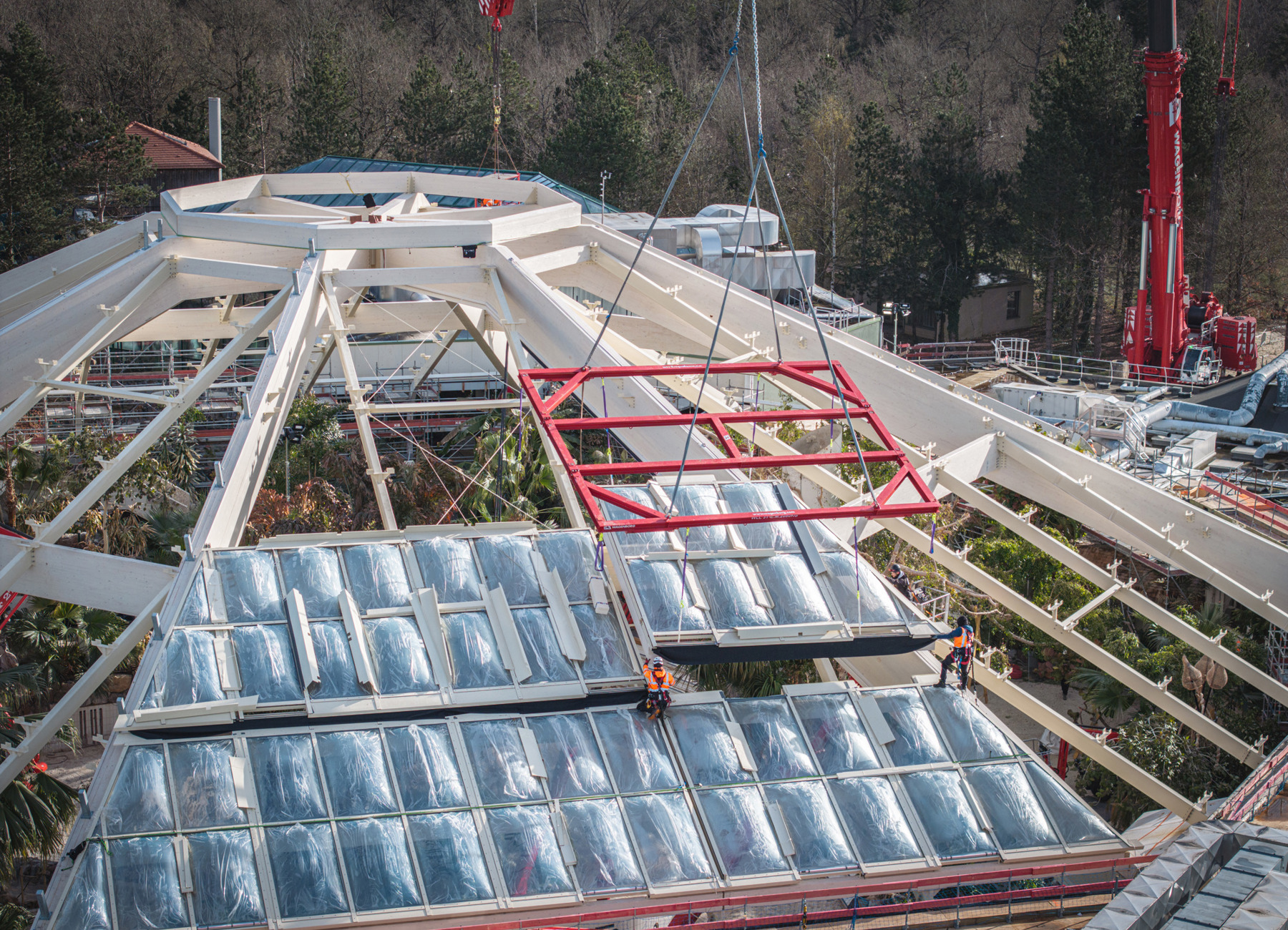 The new plastic domes were pre-assembled in 64 modules in the car park outside the park. From there, they were transported to under the crane hook. For hoisting, our engineers developed a special lifting frame, a practical hoisting tool equipped with different coloured lifting eyes that corresponded to the various types of modules. Above this, a balancer was deployed again for efficiently and safely setting the right lifting angle.