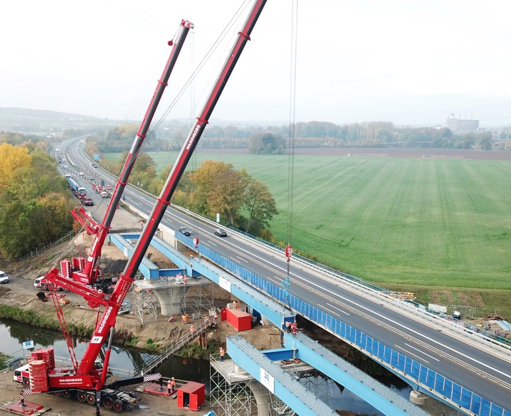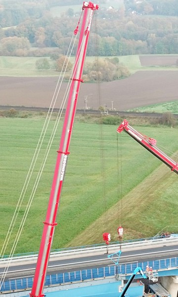 Crane 2, a 700-tonne crane positioned on the other side of the river Löhne, was now able to take over one end of the beam from crane 1. A so-called triangle was used to attach the load to two cranes at the same time. After being hooked by crane 2, crane 1 was able to take over the other end of the beam from the SPMT, following which both cranes positioned the beam on the foundation by lifting in tandem.