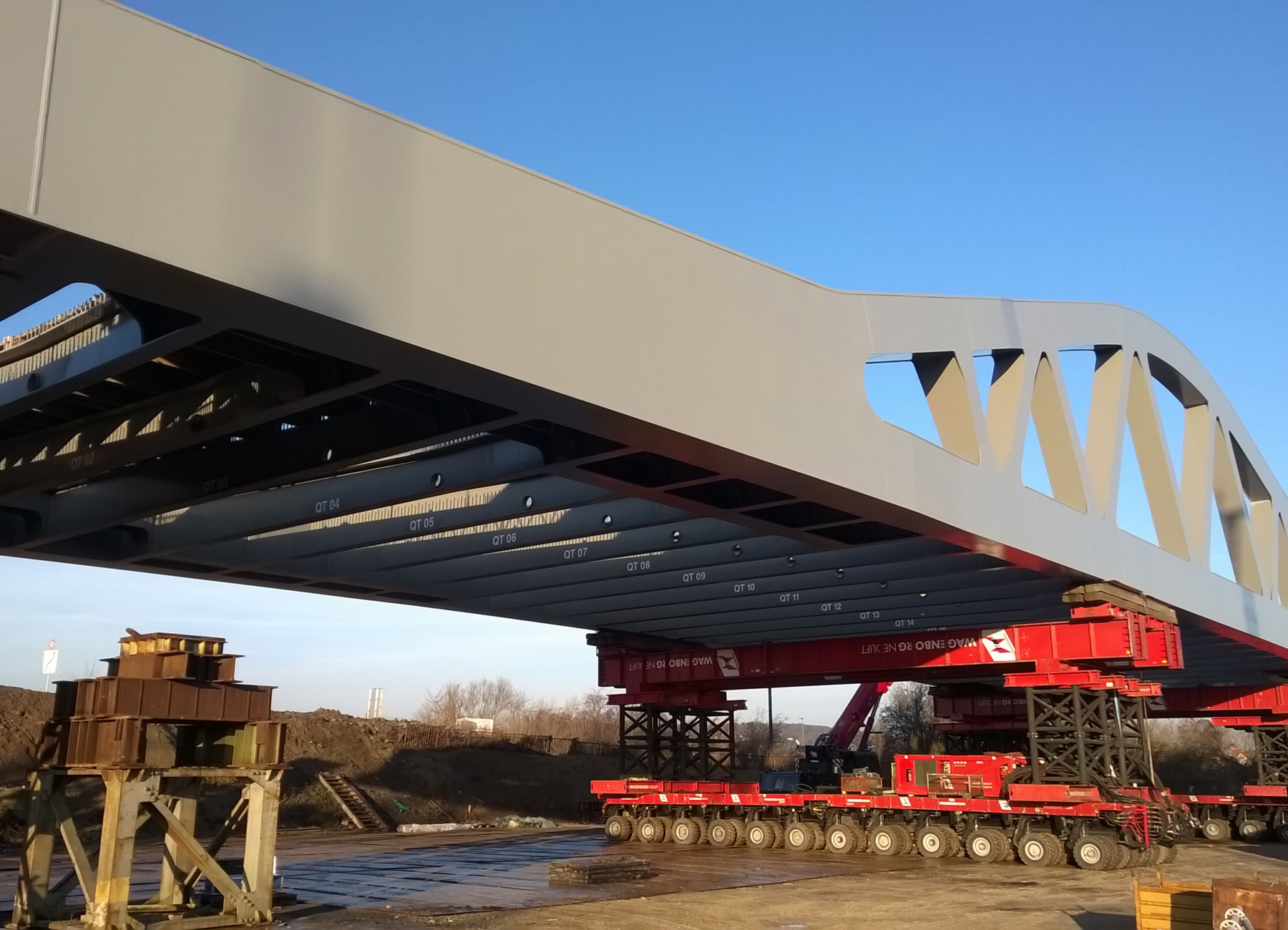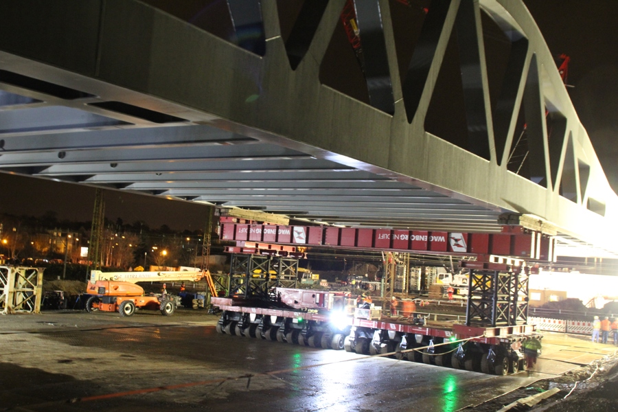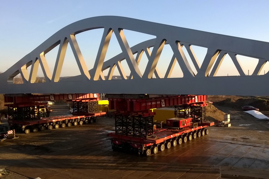 In the months prior to installation, the complete bridge was built right next to the track. Shortly before the day of installation, the bridge was jacked up and loaded onto SPMTs. On the other side of the track the 650-tonne crane was ready for action.