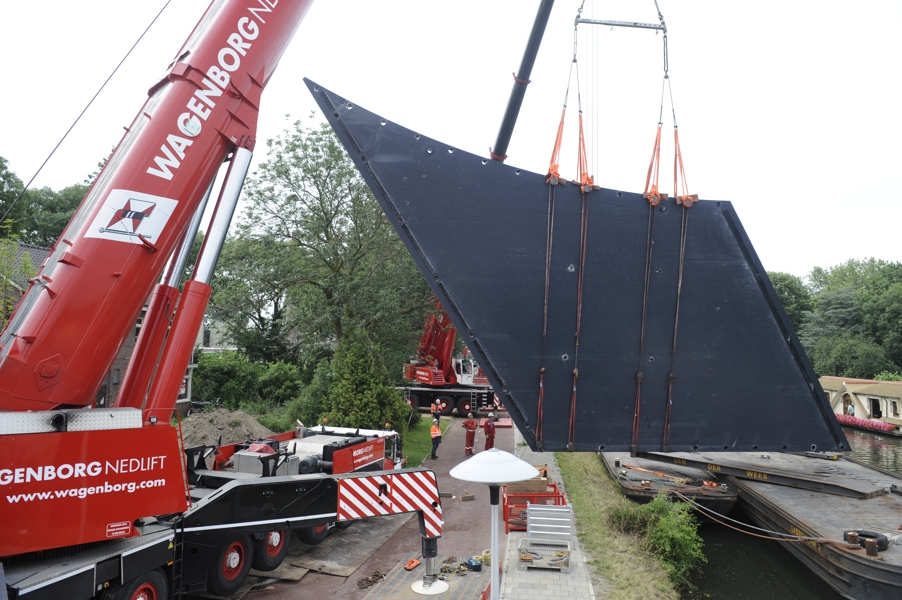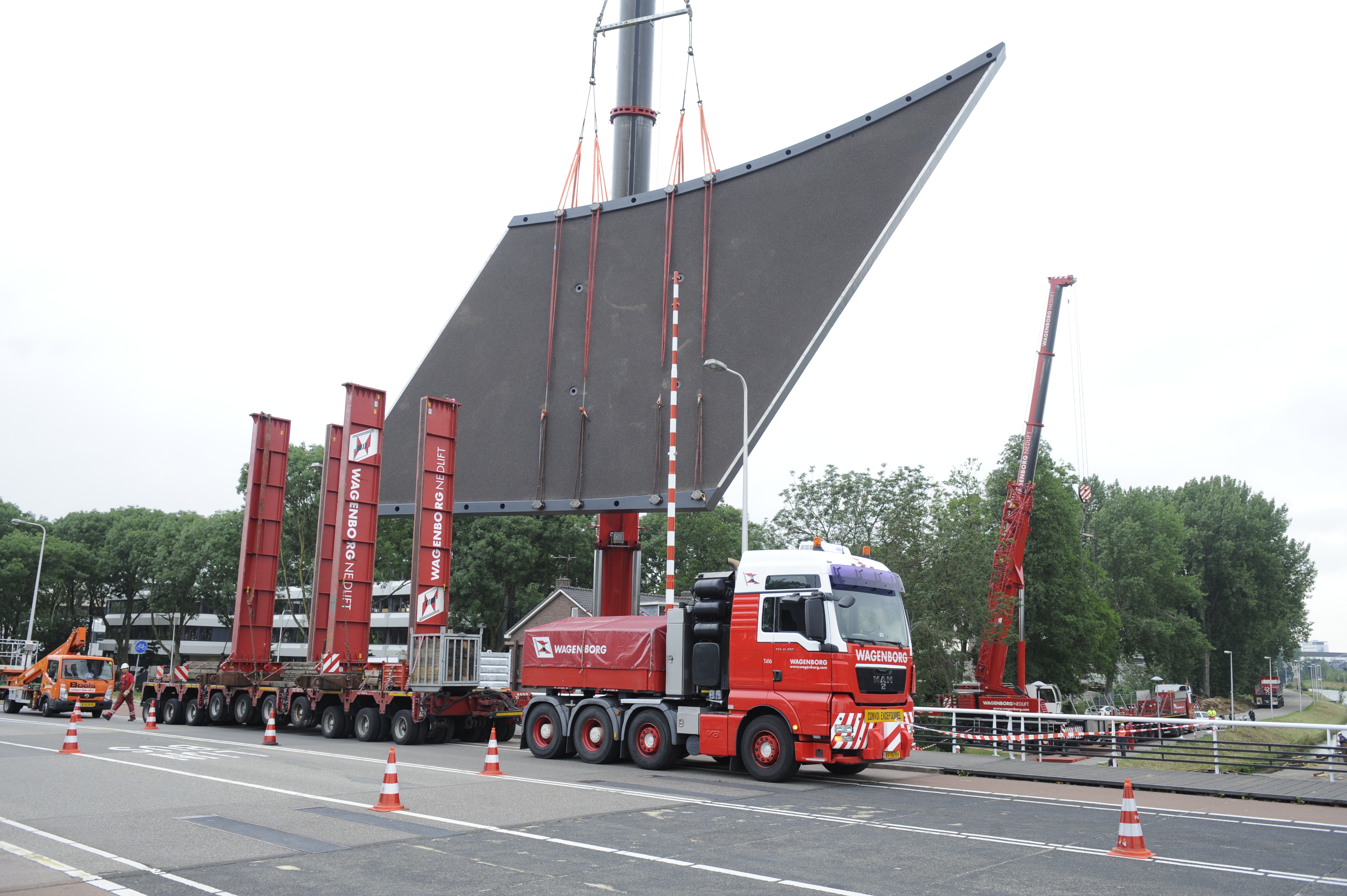 The prefabricated composite bridge section with extraordinary dimensions of 14 x 23 metres, weighing 45 tonnes, having a unique design was manufactured in Rotterdam. The bridge deck was transported by barge in a horizontal position to the Balije bridge in Utrecht, about one kilometre from its final destination.