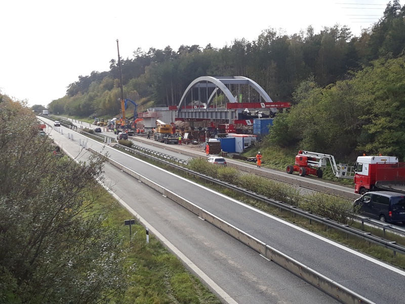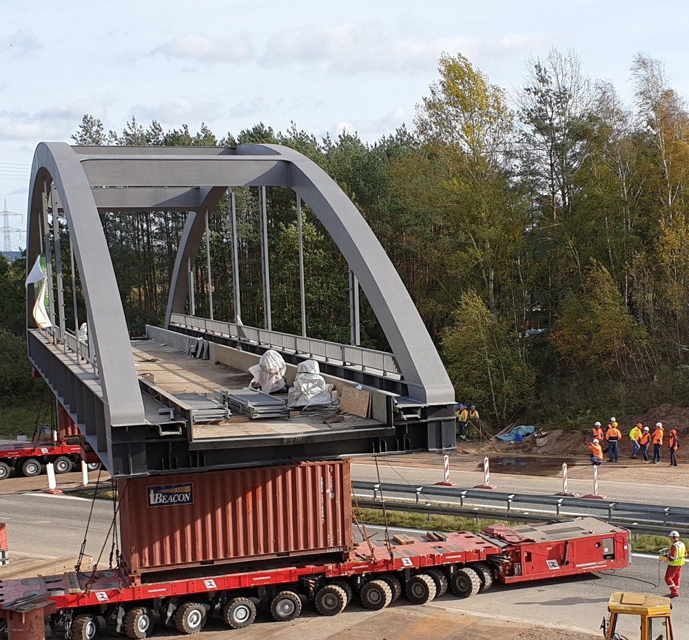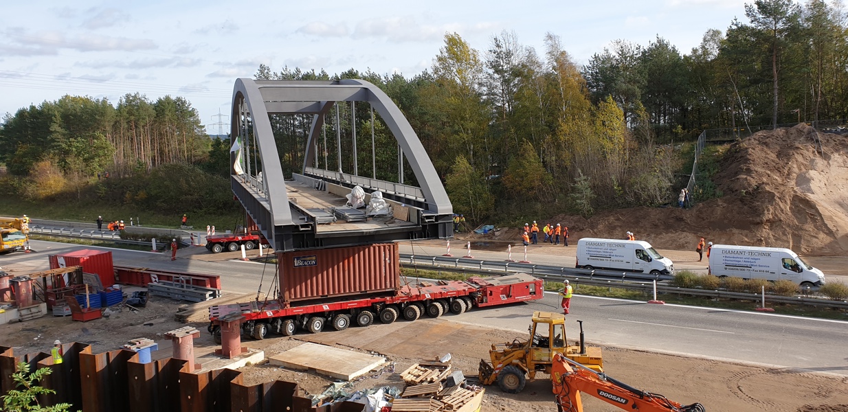The regional rail link from Parchim to Schwerin crosses the A14 motorway at Plate. Demolition and construction work therefore had to be carried during short weekend closures of the motorway. The new railway bridge, weighing over 320 tonnes with a length of 42 metres, was assembled at ground level on a tiny construction site right next to the motorway.