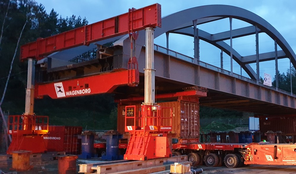 No sooner said than done, in November 2019 Wagenborg Nedlift's transport and lifting specialists arrived at the construction site next to the motorway. Using the gantry system, the bridge was quickly and safely raised to the correct transport height, after which the SPMTs, equipped with container supports, drove under the bridge.