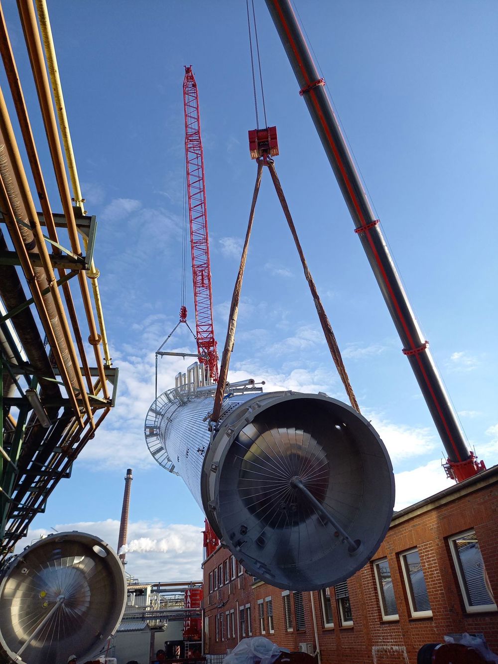 'We developed this concept further into detailed lifting and erection plans, which served as the basis for the implementation. The 500-tonne Demag AC 500 was used to unload and assemble the columns. It was positioned directly behind a building and had a small clearance between the building and the crane mast during lifting. After the storage tanks had been brought in and assembled, the 700 tonne crane was mobilised as the main crane and the 500 tonne crane as the 'tail crane'. The main crane (type LTM 1650-8.1) was set up between two buildings, with additional ground pressure reduction measures and the erection of the 42-metre luffing jib. A little further away was another, slightly smaller crane with a man basket to pick up the slings at height. So we carried out the project in three phases of two storage tanks each.'