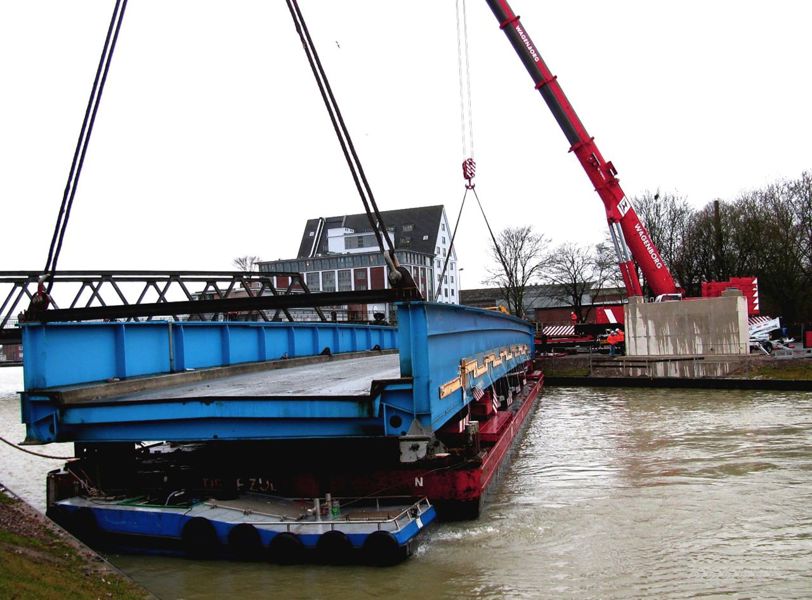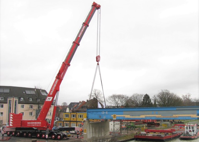 The temporary bridge was loaded onto Wagenborg Barge 3 in nearby Waltrop using a skidding operation and then sailed via the Dortmund-Ems Canal to the Schillerstrasse location in Münster. Weighing 208 tonnes and measuring 51 metres, this temporary bridge was a whopper!