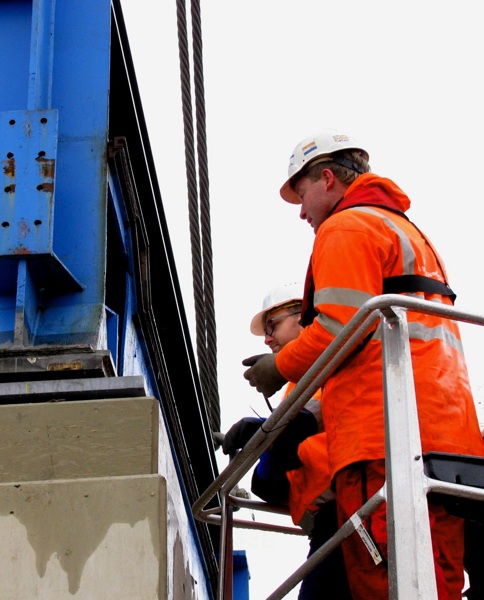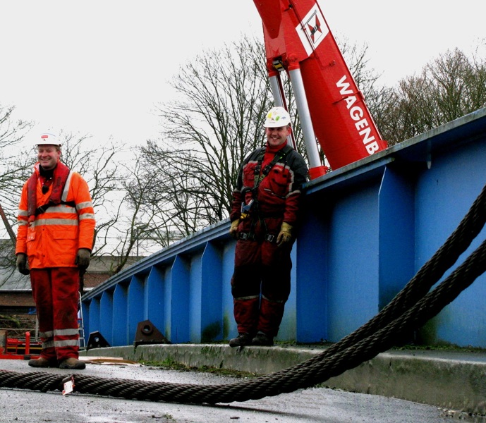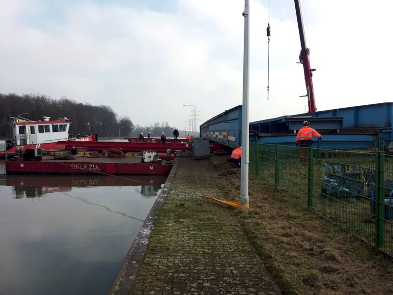 Therefore, two of the heaviest mobile cranes were used for placing it onto the foundations: a 700-tonne and a 750-tonne crane. After the pontoon was turned in the canal these heavy boys were able to hook both ends of the bridge and put it on the foundation.