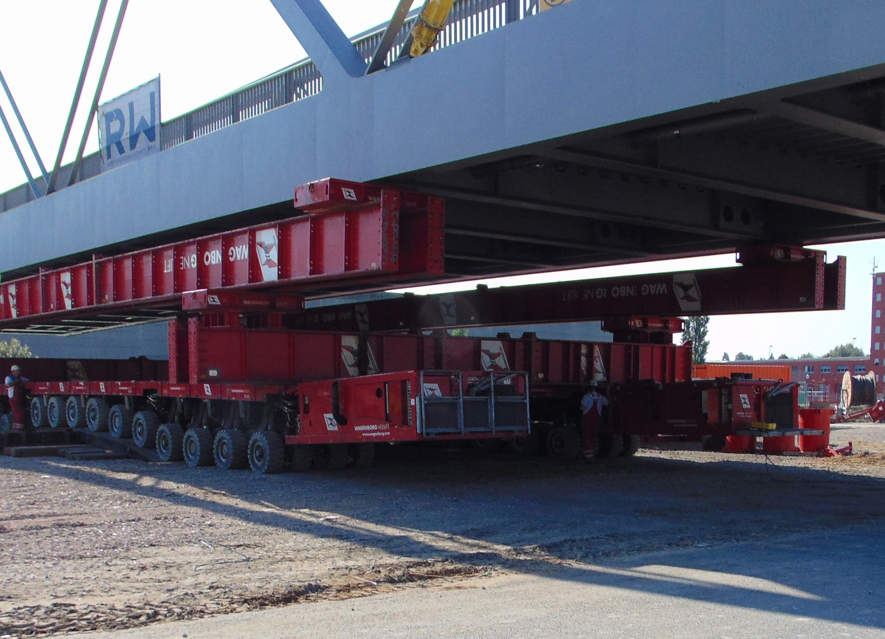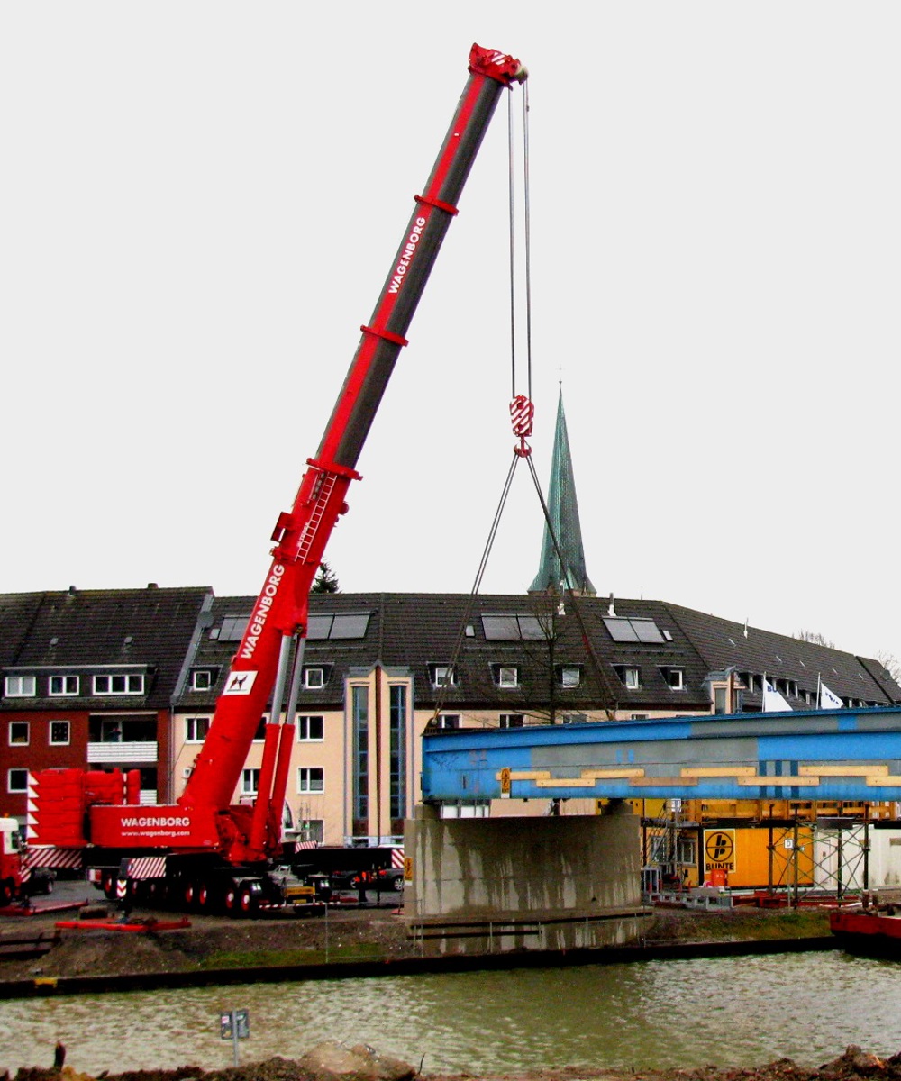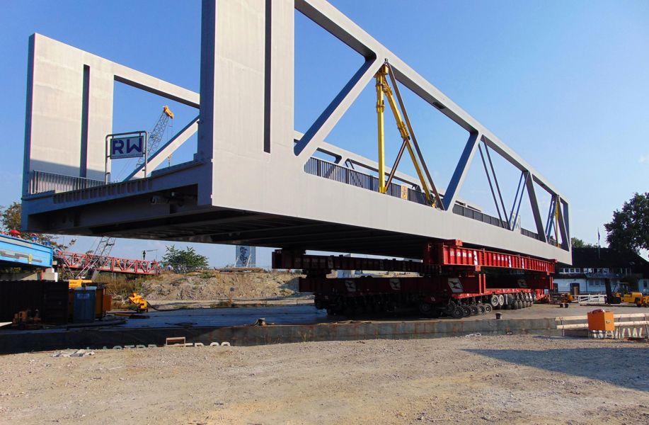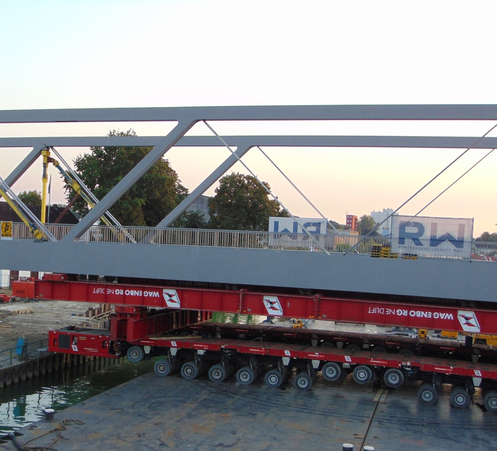 At the Schillerstrasse Brücke, the client pulled a type of fast-change trick: Before the old bridge was replaced, a new temporary bridge for cyclists and pedestrians was put in place. The Wagenborg Nedlift team was called upon to transport and put it in its place. Due to the combination of 'wet' and 'dry' work, specialists from both Wagenborg Nedlift and Wagenborg Towing Services were engaged to prepare and execute this project.