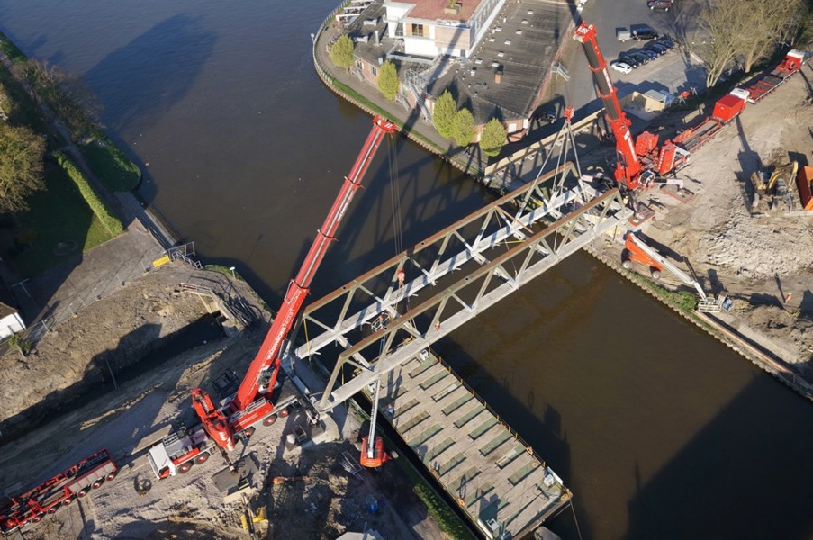 Now that the connection across the canal had been restored, dismantling the old bridge could begin. Wagenborg Nedlift provided mobile cranes for this job.