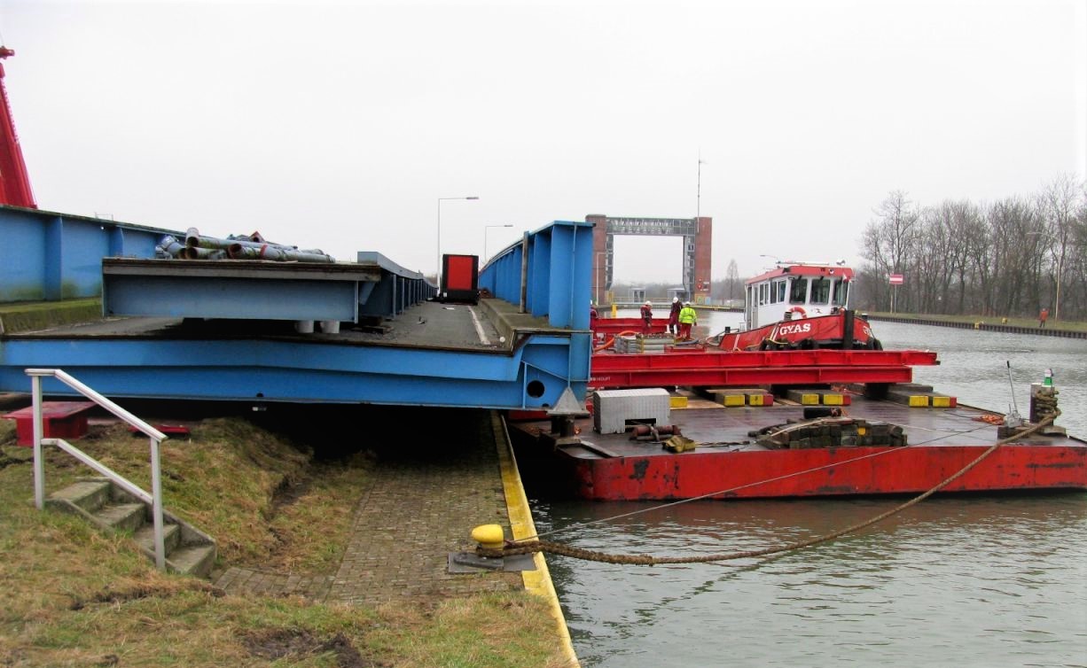 The transport and placement of the new bridge over the canal presented very different challenges. First of all, the bridge needed to be temporarily reinforced with support beams to absorb the forces created during transport and installation work. In addition, the space available for manoeuvring at the foundation was very limited and working on the pontoons also involved some inching and pinching to turn the bridge.