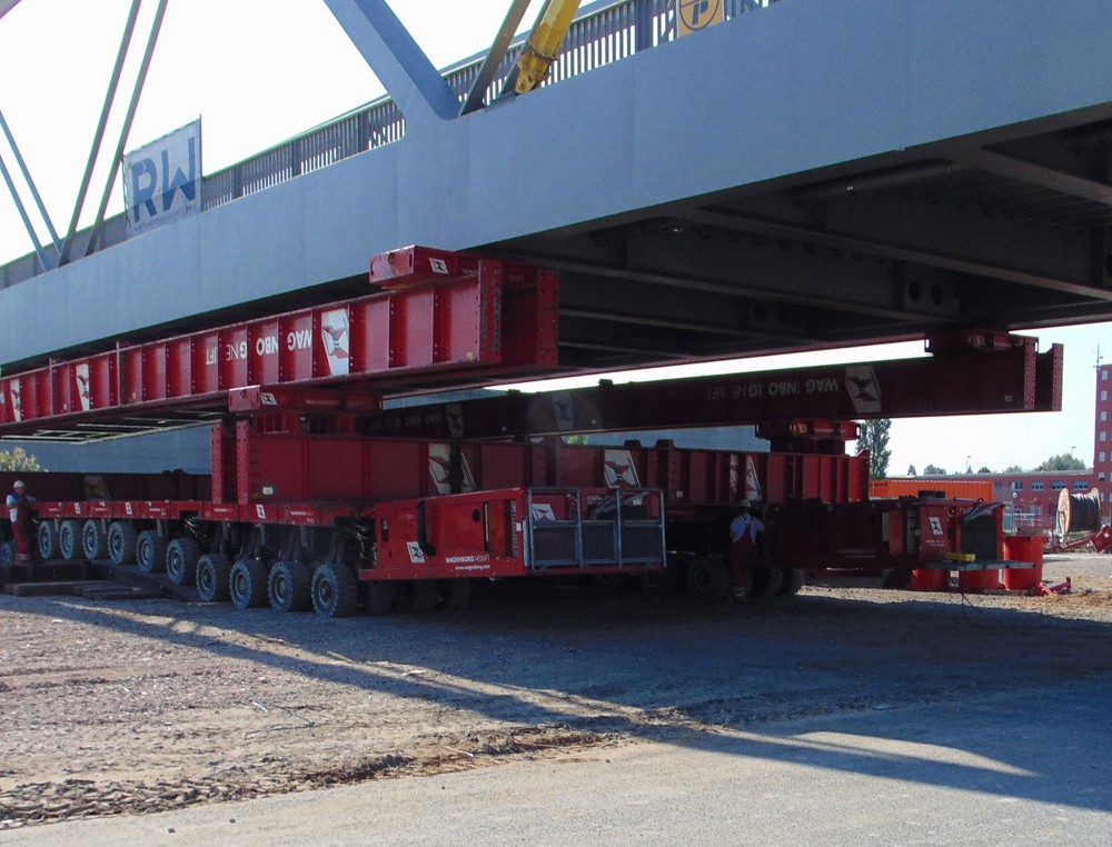 In the end this resulted in a solution whereby some axles of the SPMTs were lifted to create the necessary room for manoeuvre and to counterbalance the occurring forces.