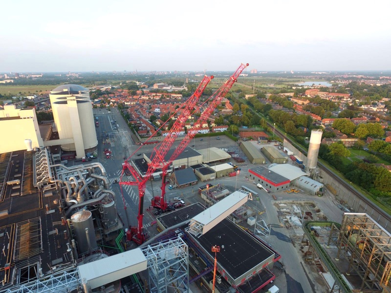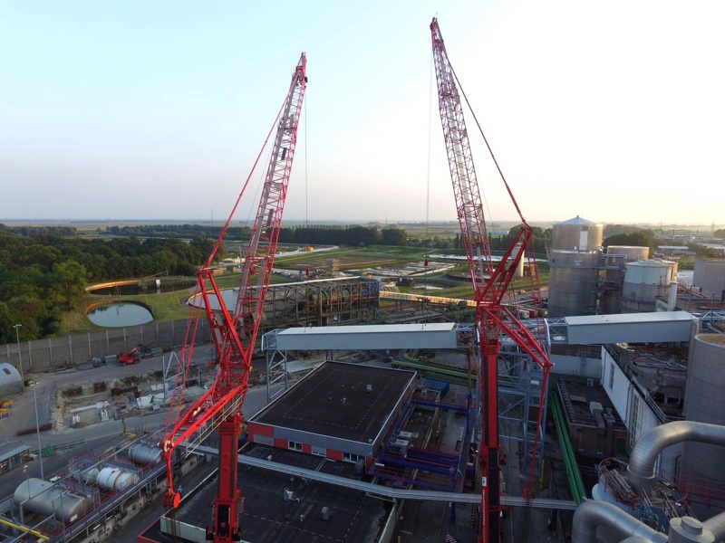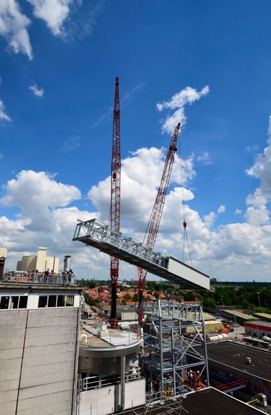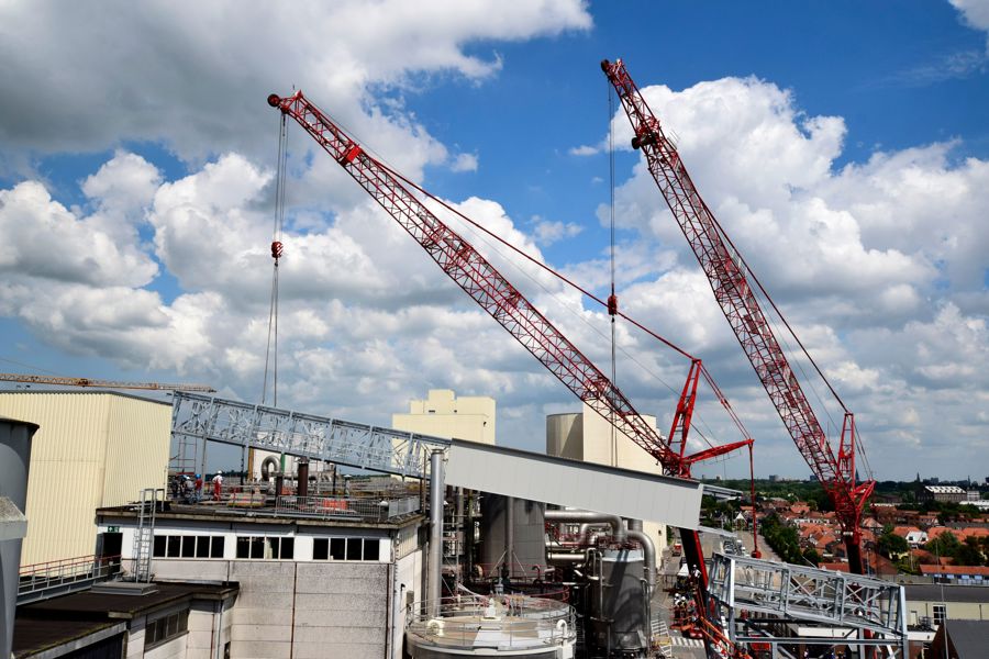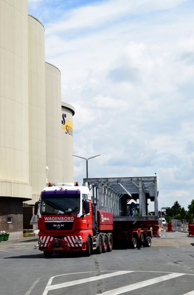 The four conveyor belt sections are fabricated by Staalbouw Smid, located in Hoogkerk (Groningen, the Netherlands). On site, the sections were transported by Wagenborg Nedlift's dolly combination up to below crane hook.