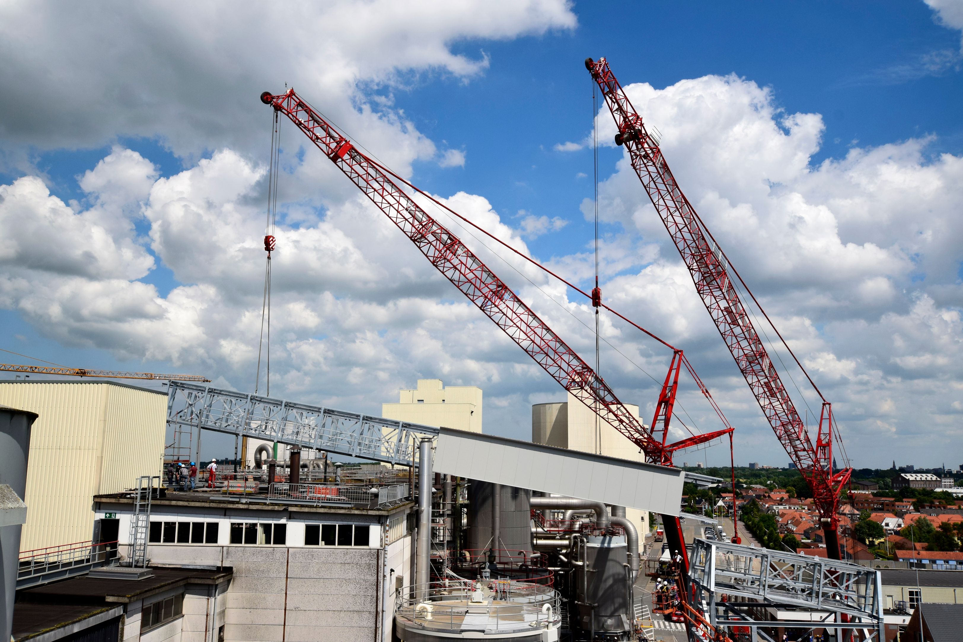 The narrow space on site was a real challenge in this project. Both the 500 tons and 700 tons mobile cranes were positioned up to the centimeter exact in order to be able to perform the lift. Due to lifting height of the conveyor belt, which had to be installed above existing sugar mill structure, both cranes were equipped with luffing jib. Equipped with this configuration, the operation of turning the piece between the cranes and positioning onto foundation could be done. The full operation was carefully engineered and prepared in close cooperation with the client.