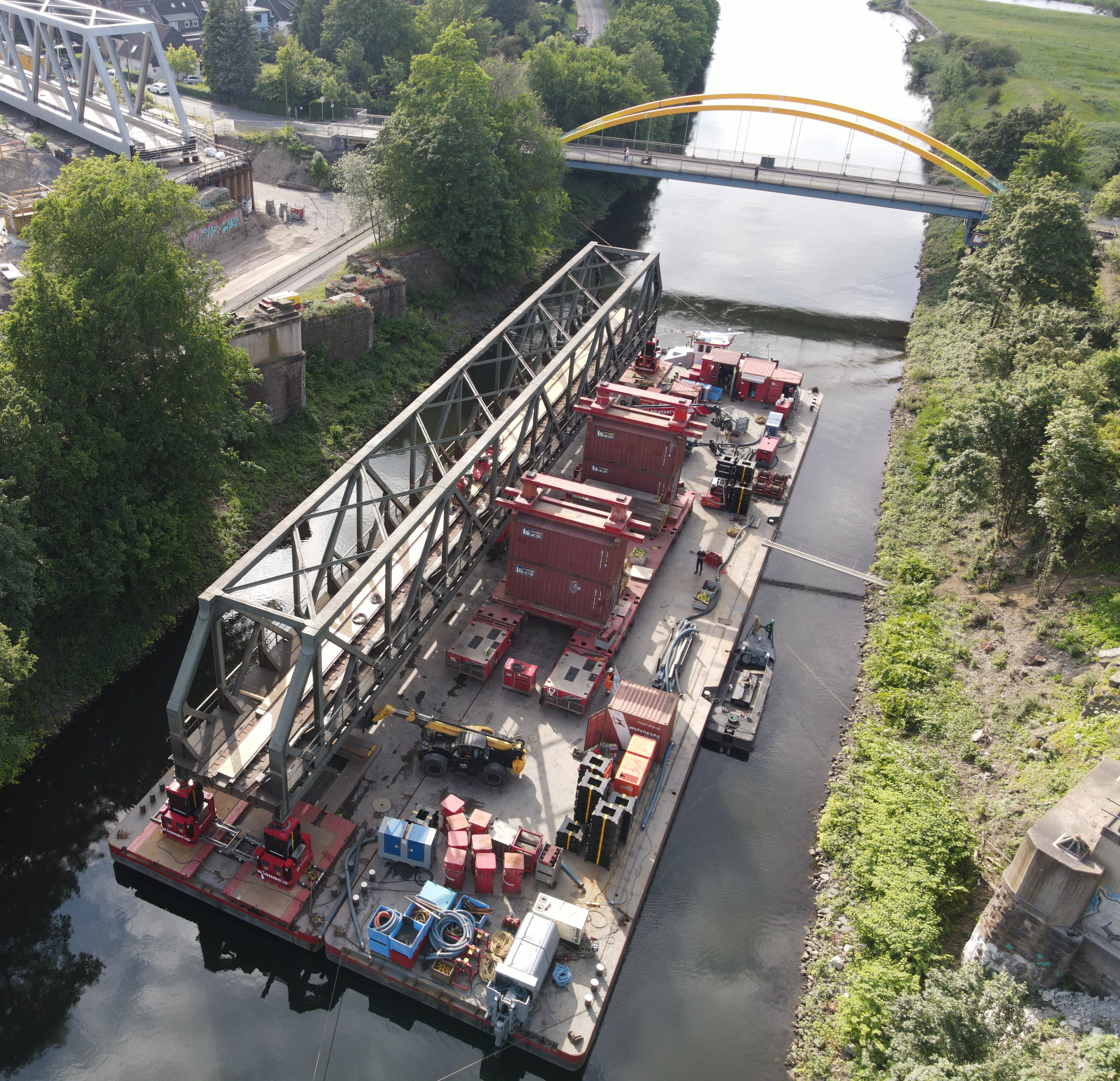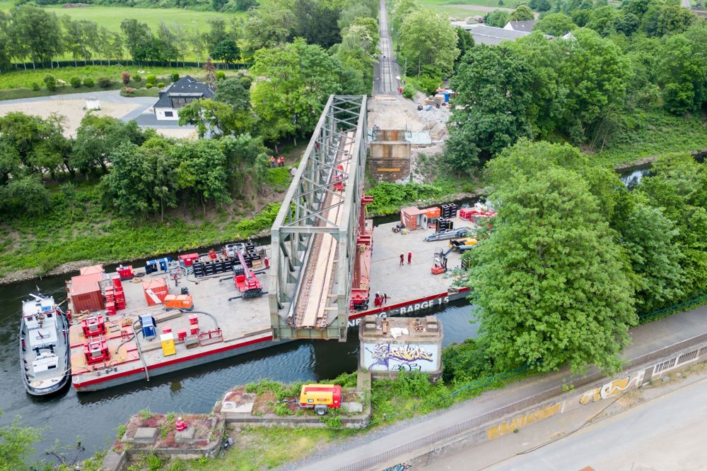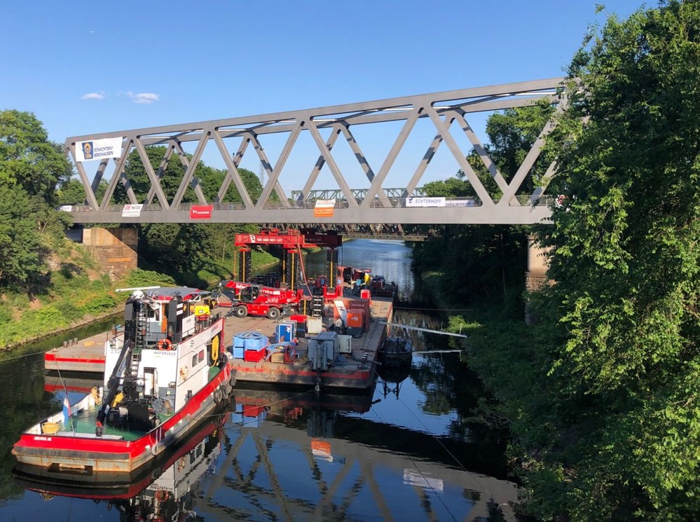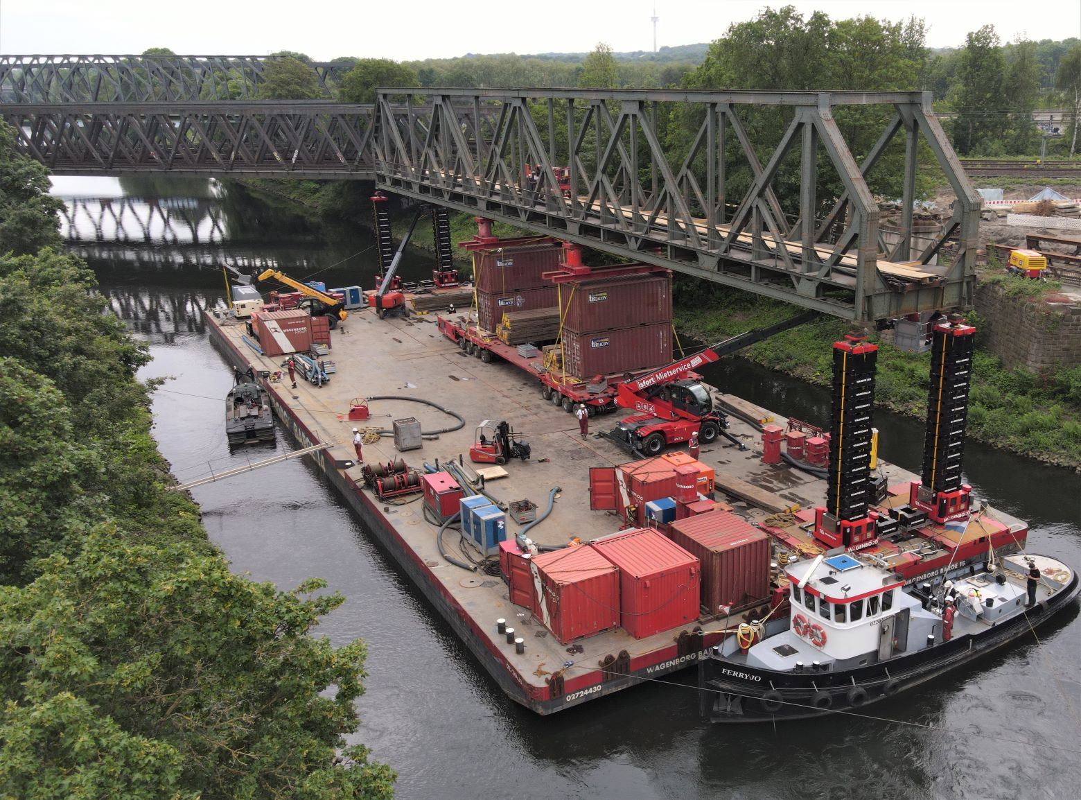 The new railway bridge, a 110 meter long colossus weighing 900 tonnes, was already ready at the construction site next to the railway. 'Once the old bridge had been dismantled and removed, we set up the pontoon for the new bridge to be moved in. This was a completely different method to the dismantling process,' says Alwin.