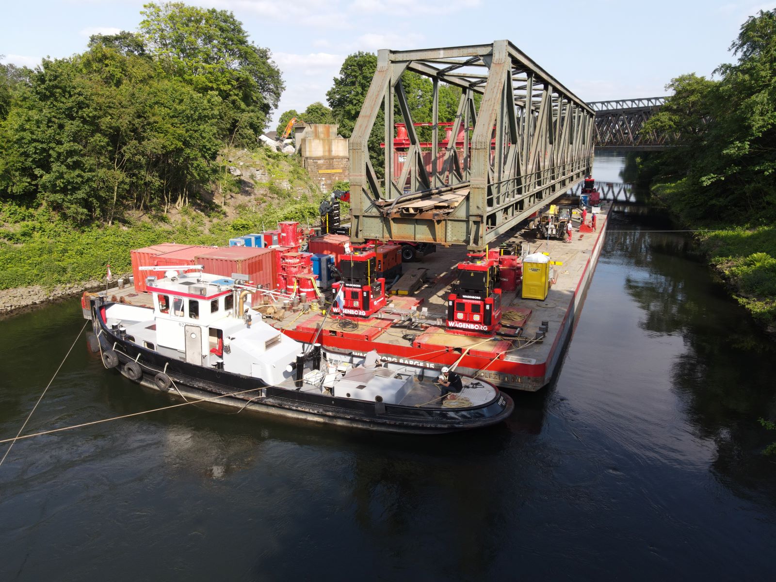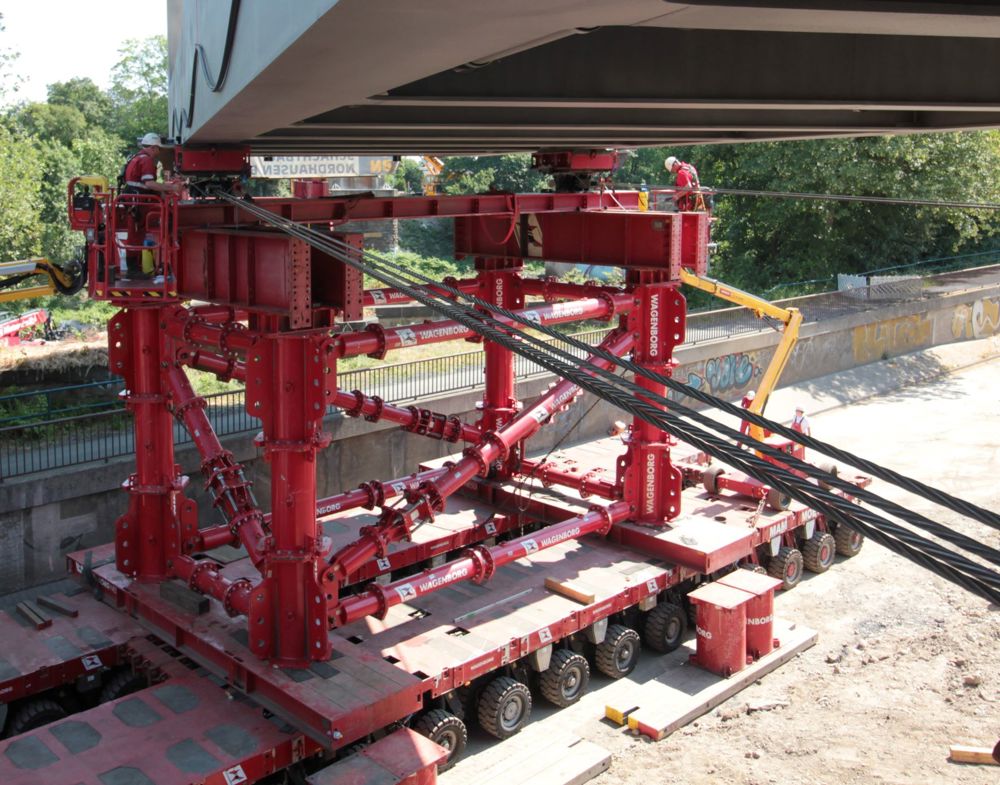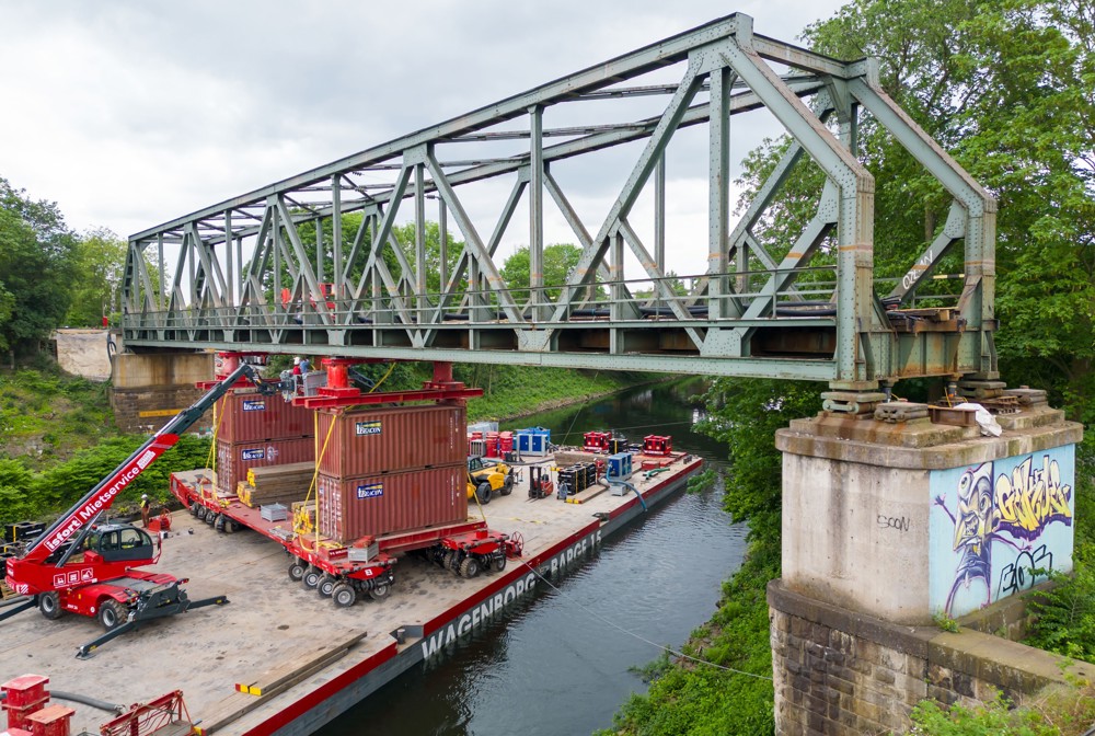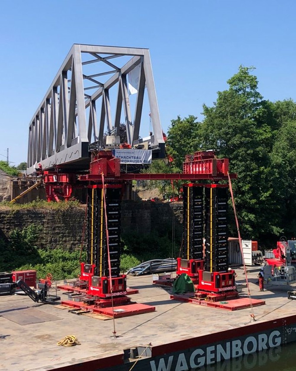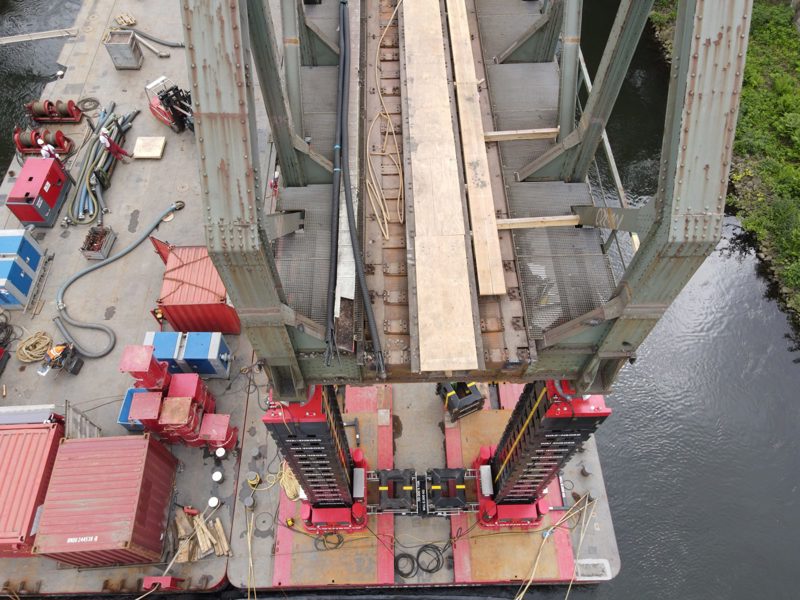 ‘Using the trailer hydraulics and a ballast operation with the pontoon, we easily lifted the bridge off the abutments and then turned it 90 degrees. The JS250 box jacking system was then used to lower the bridge 10 meters so that it was at working height on the pontoon. It was then dismantled by the demolition contractor.’