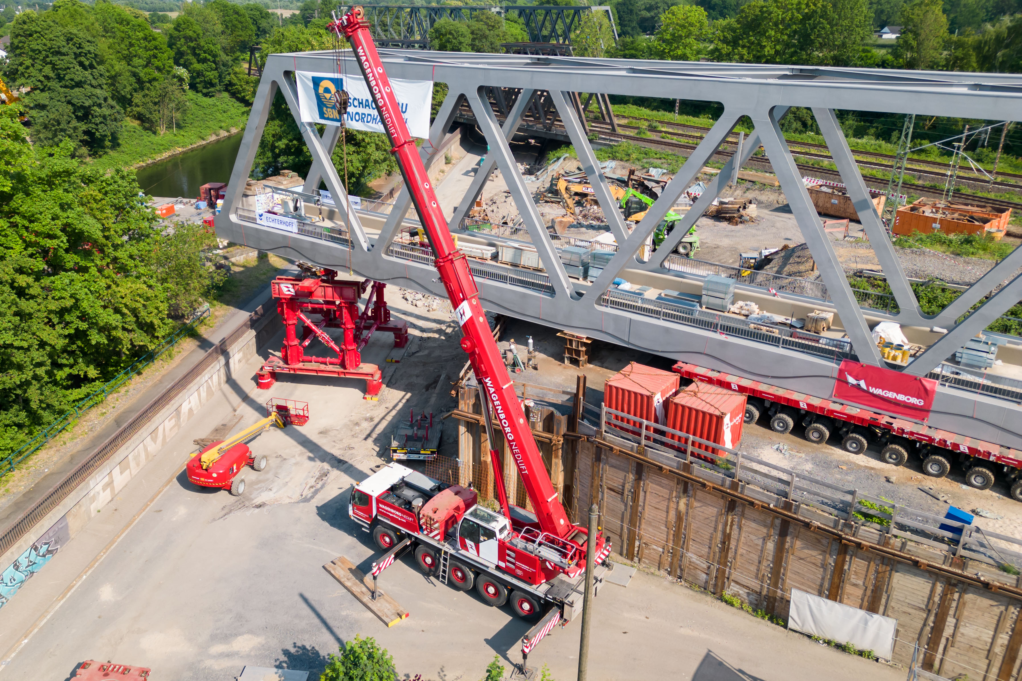 To do this, we built two large container support structures on our SPMT trailers. The supported SPMTs were positioned on a coupled pontoon from our colleagues at Wagenborg Towage. This enabled us to navigate under the middle section of the bridge. In addition, our lifting team lifted the abutment bridges with the 500-tonne and 700-tonne mobile cranes prior to removal.’
