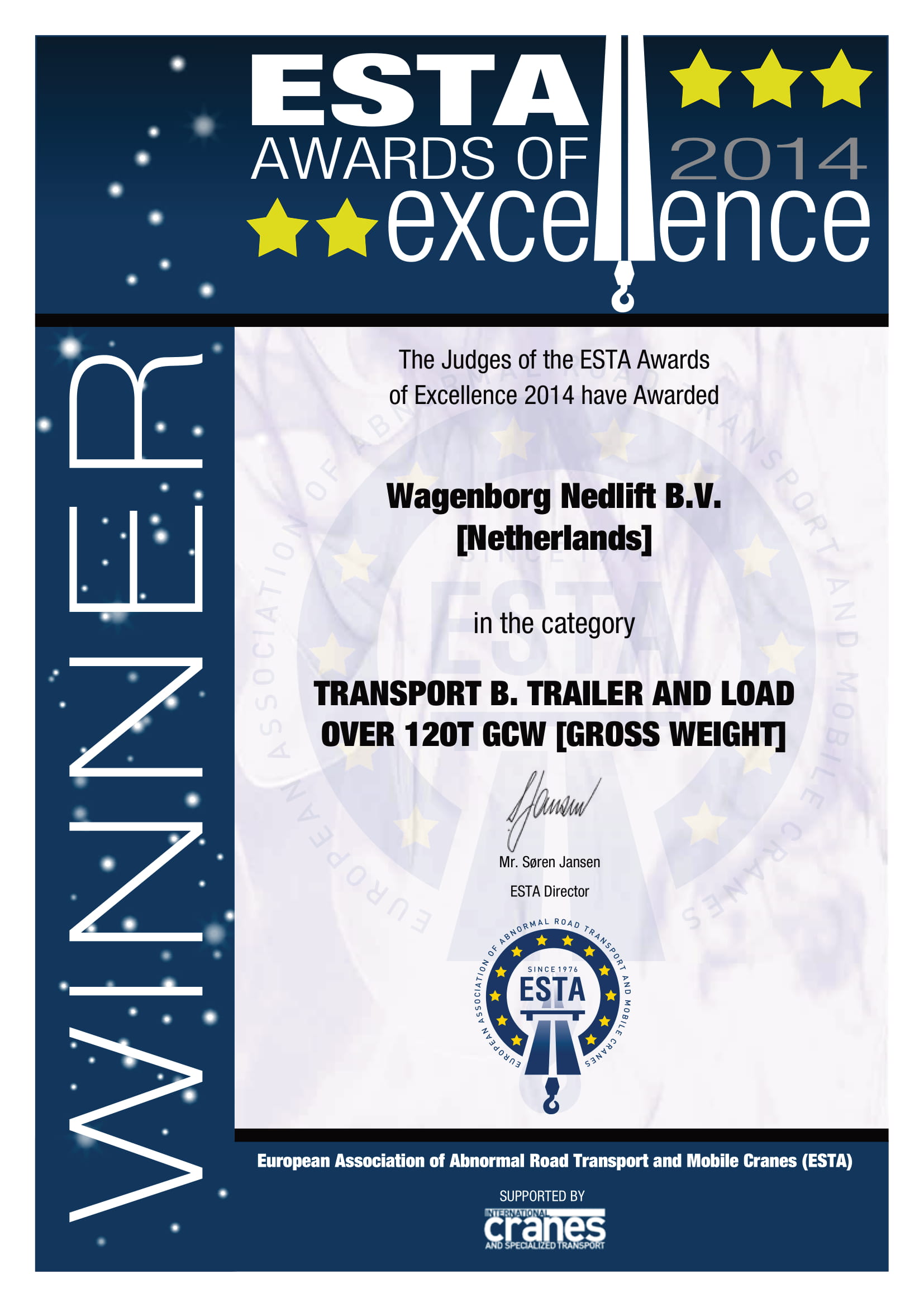 ESTA is the European trade association for the heavy transport, lifting and crane rental sector. ESTA represents the national trade associations in the sector. Every year ESTA Awards are presented for projects that stand out in the field of technical ingenuity, innovation or safety.