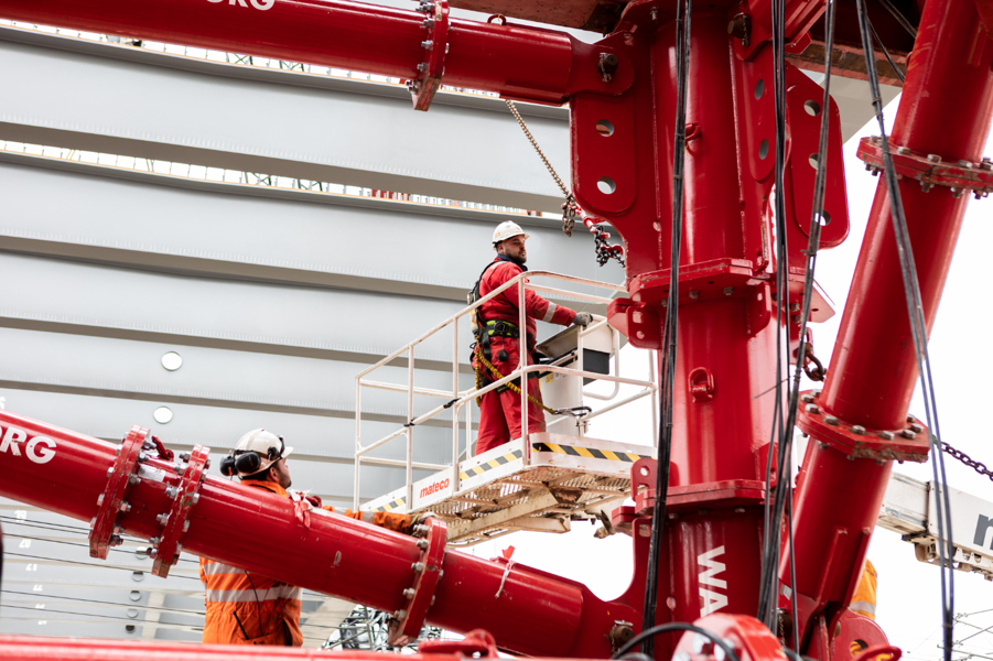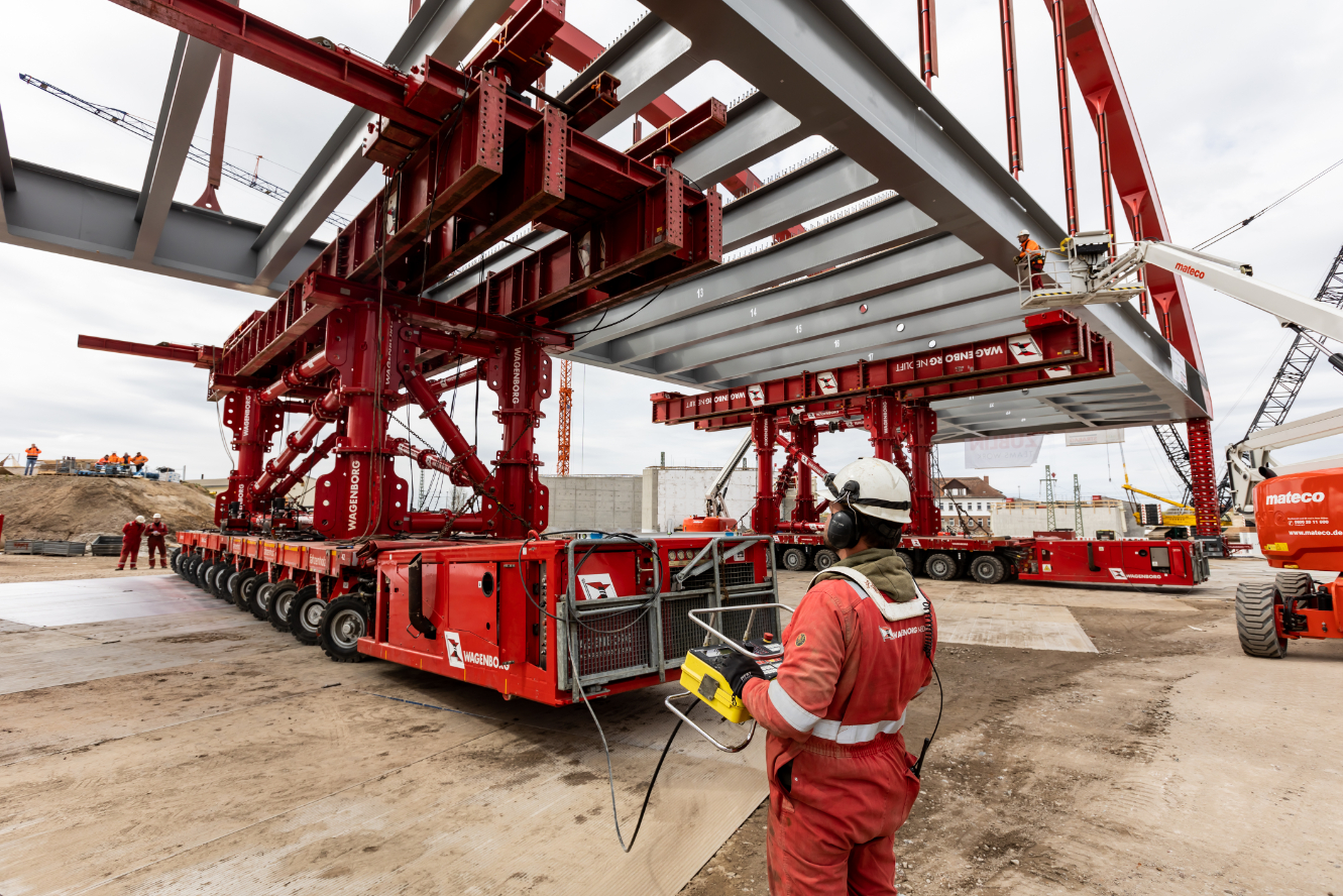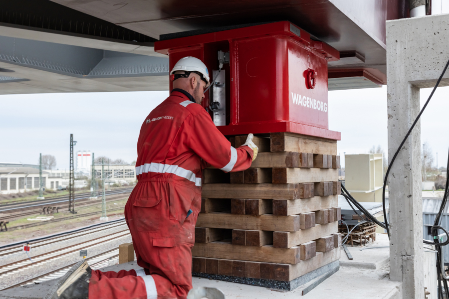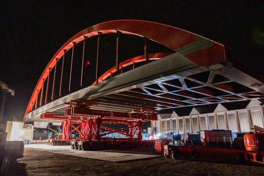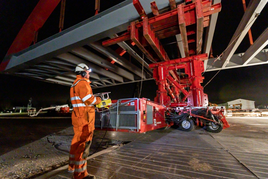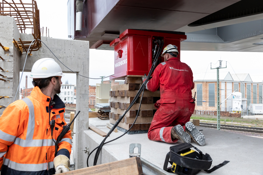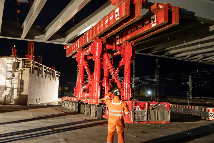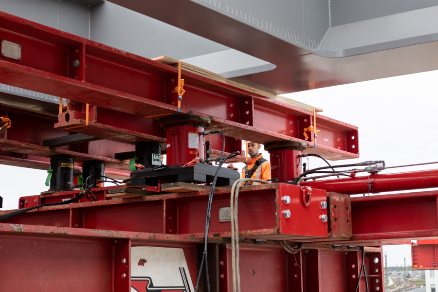 The engineers from Wagenborg Engineering opted for the use of a combination of techniques to install the bridge. On one side of the track, where the bridge was assembled at the construction site, SPMTs were used for the transport. On the other side of the track, a 600-tonne crawler crane was ready to take over the end of the bridge. For the horizontal movement across the track, the engineers opted for Wagenborg Nedlift's own developed sliding system. Finally, several jacking systems were used for the vertical positioning.