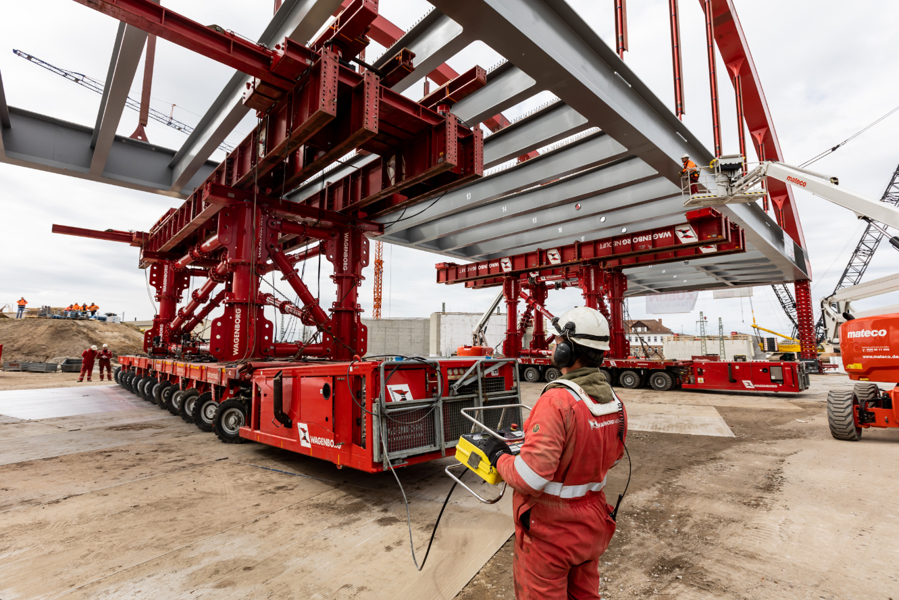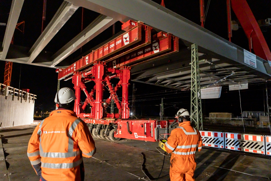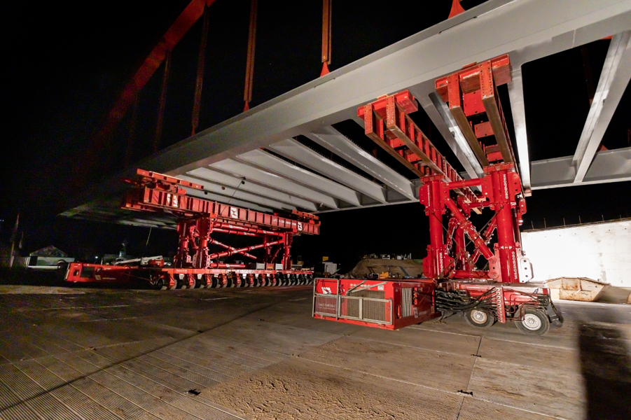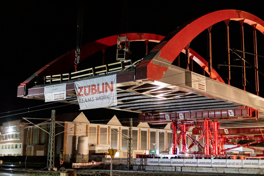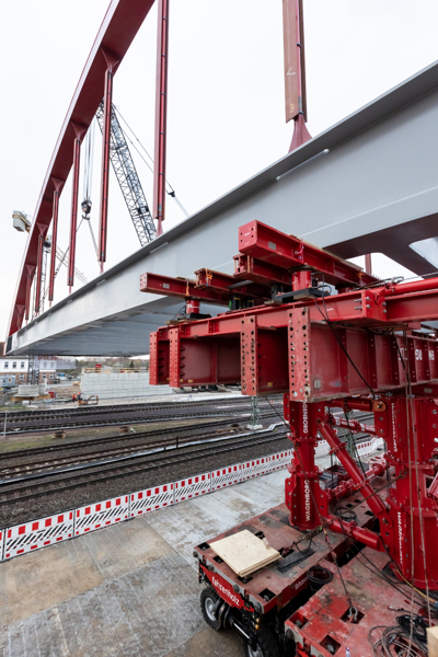In the past few months, large structural components of the bridge were transported from the construction workshop to the construction site next to the railway tracks. There, the steel construction specialists assembled the bridge into a colossus measuring no fewer than 73.0 metres long, 18.0 metres wide, 15.0 metres high and weighing 660 tonnes