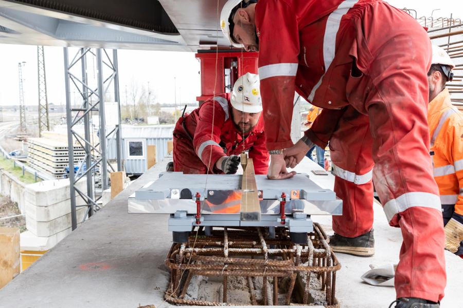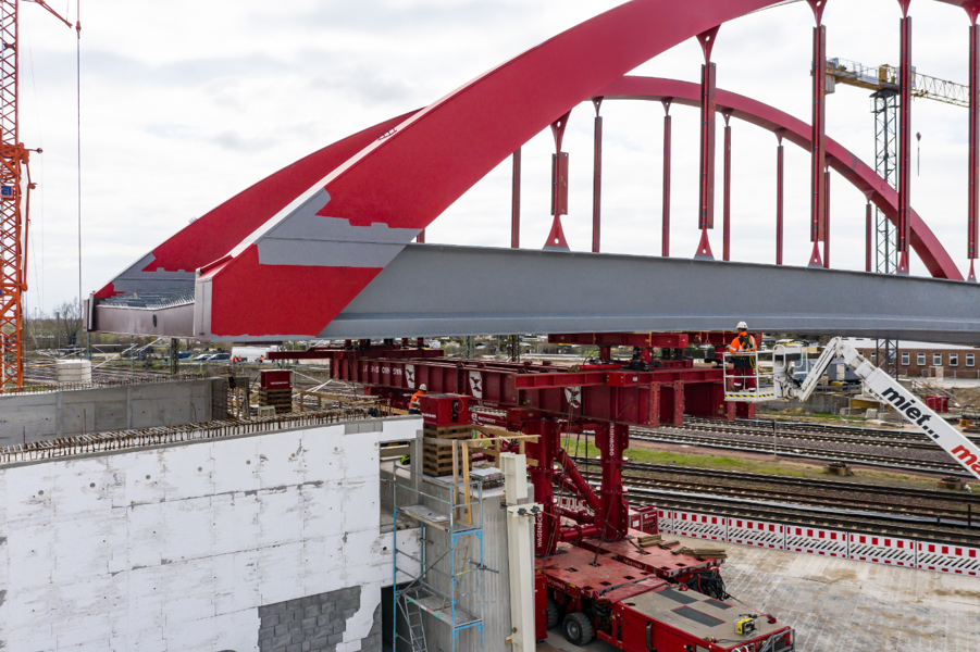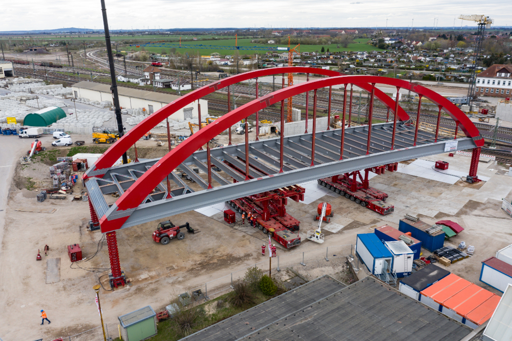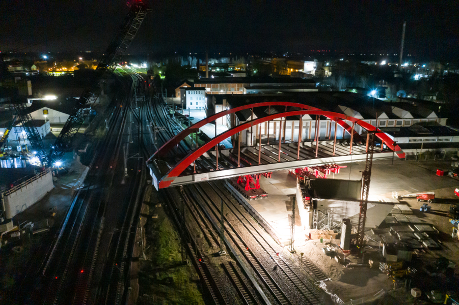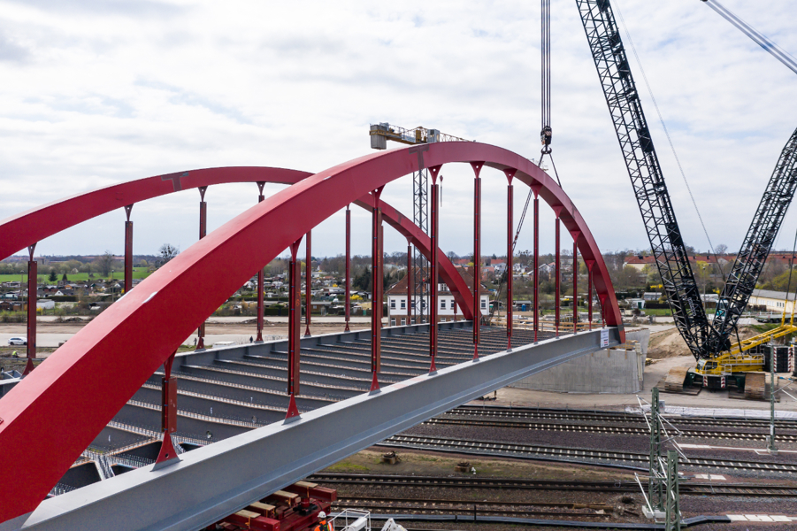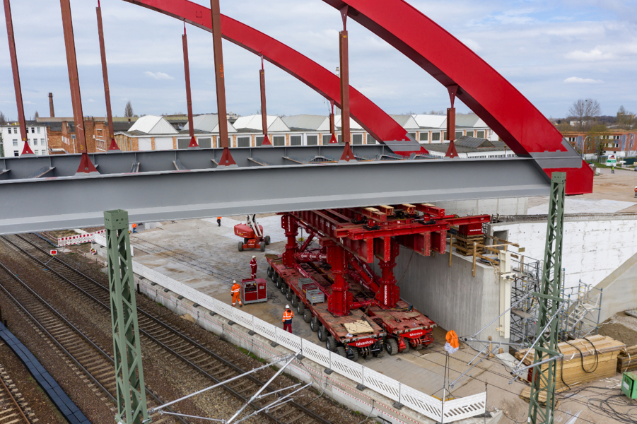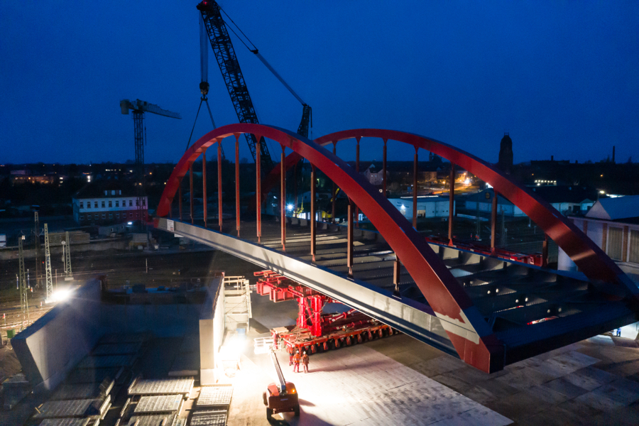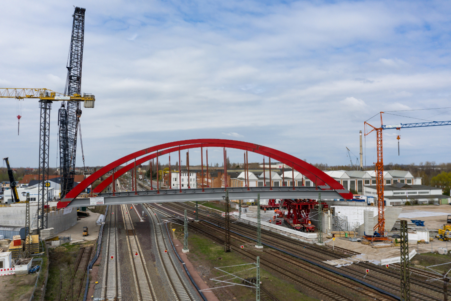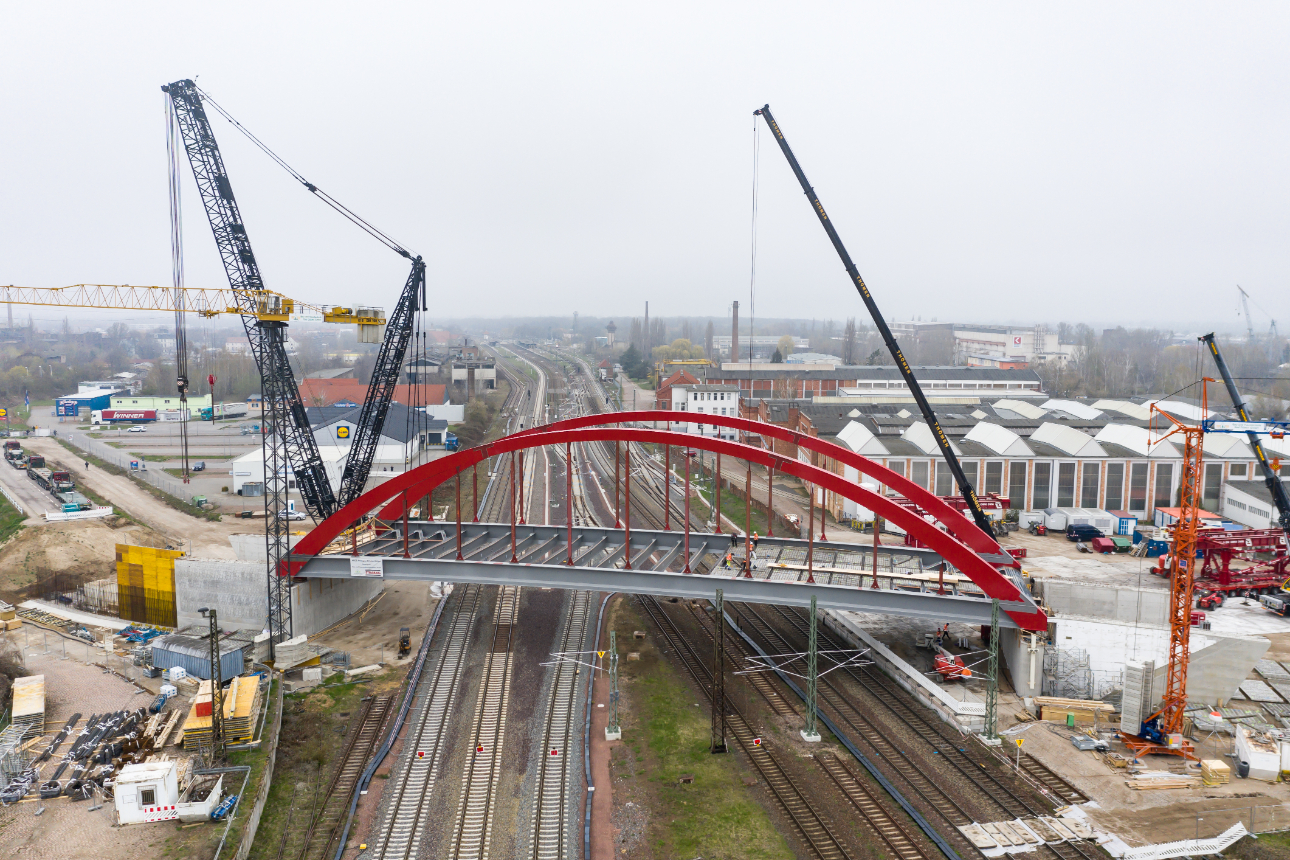 The new arch bridge weighing more than 660 tonnes forms a key component of one of the largest infrastructure projects in the region, connecting the inner city of Köthen with important arterial roads. In addition, the bridge is elevated, making it possible for the catenaries on the important Halle - Magdeburg rail link to be adapted in accordance with the new requirements.