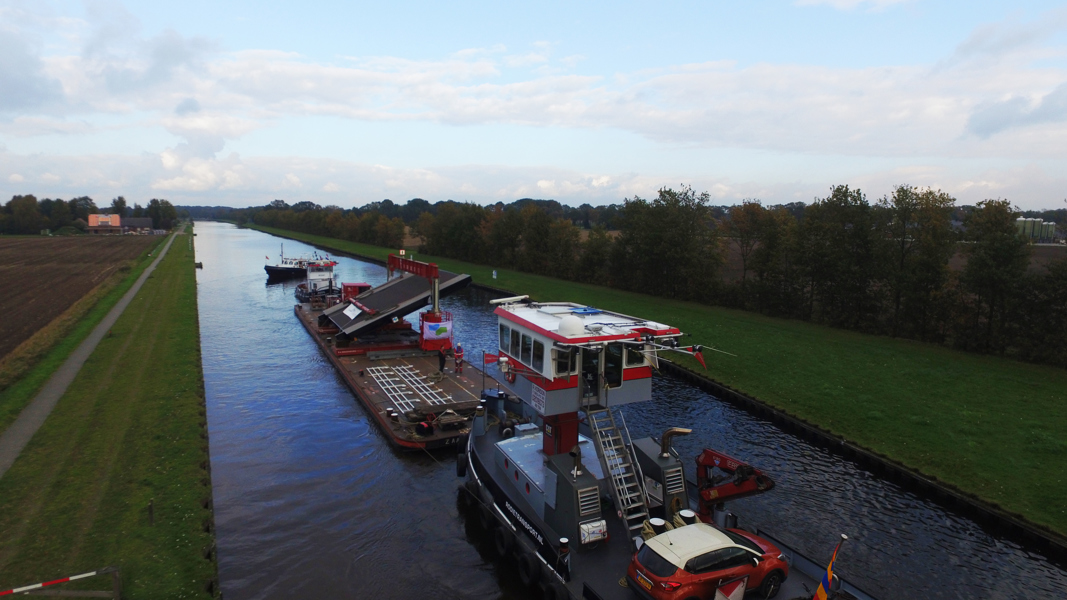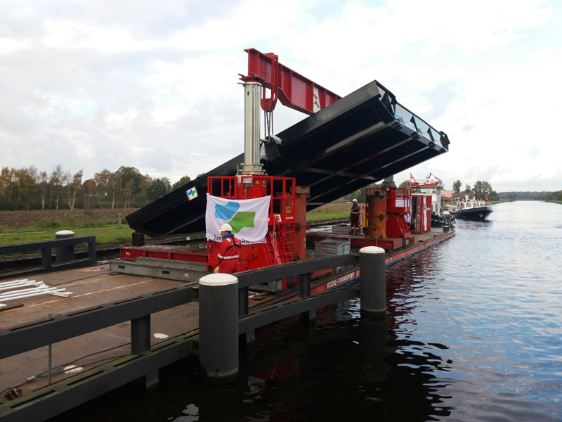 This solution ensured that the bridge deck was successfully transported to Gramsbergen. Upon arrival, two mobile cranes installed the deck onto the new foundation.