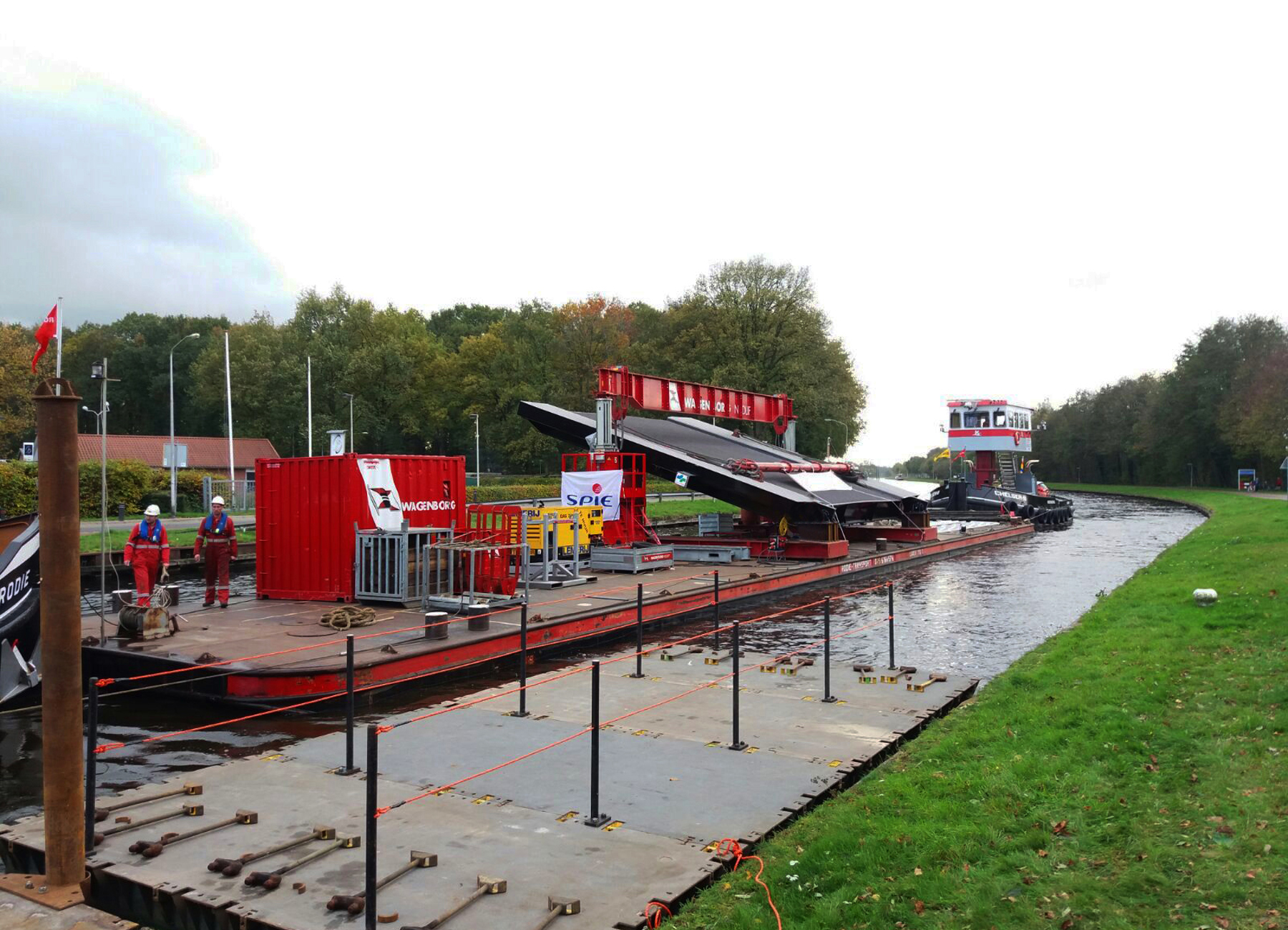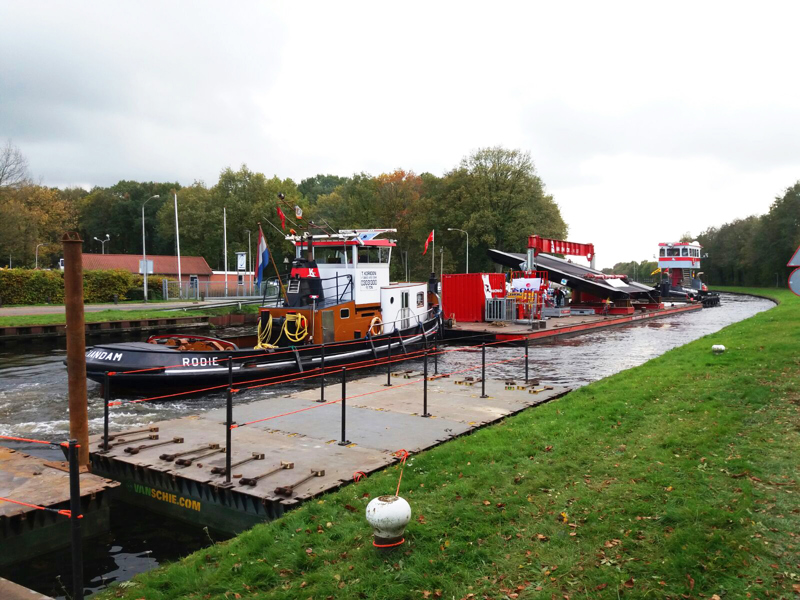 The only way to transport the bridge deck in one piece was via the canal, where several narrow passages would obstruct the transport of the deck. For example, on the route there were 5 fixed bridges with a height limit of 6.25 metres and 11 drawbridges, the narrowest of which was less than 8 metres wide. Moreover, the draught of the canal was only 2.5 metres, ruling out the option of using an inland vessel.