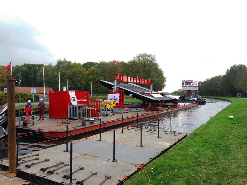 The project managers and engineers of Wagenborg Nedlift came up with a brilliant solution. A narrow pontoon in combination with a flexible gantry system to adjust the position of the bridge deck during water transport where necessary. This allowed for the bridge deck to be transported in upright position to pass through the narrow drawbridges and corridors. To pass the fixed bridges with limited height, the gantry system was able to lower the bridge deck into a more horizontal position.