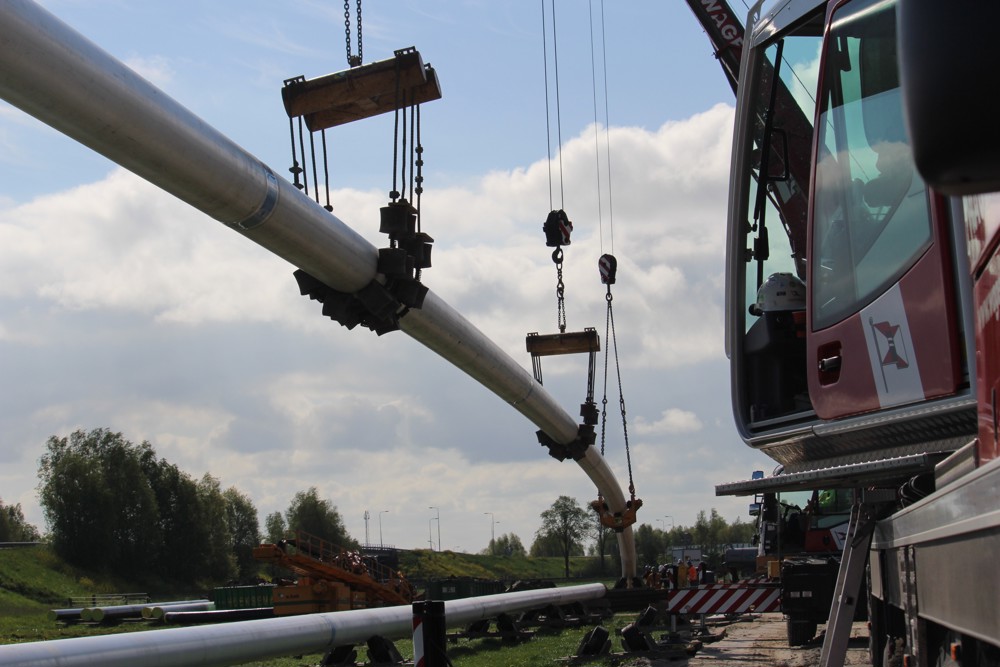 In the words of Heiko Doornbosch, Chief Foreman at A. Hak Leidingbouw B.V., “With a horizontal directional drilling operation, a pipe is installed across a particular section of the network via an underground tunnel to get past a road, waterway or cable conduit for example. After the tunnel is drilled, the pipe is withdrawn. Mobile cranes are used to keep the pipe in the correct position while it is being pulled out.”