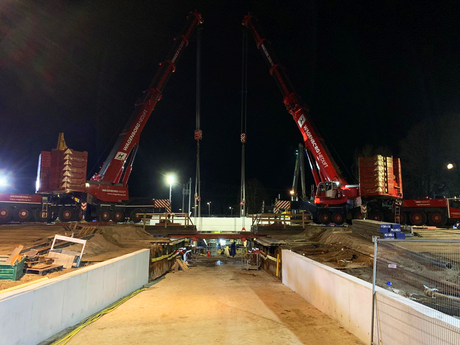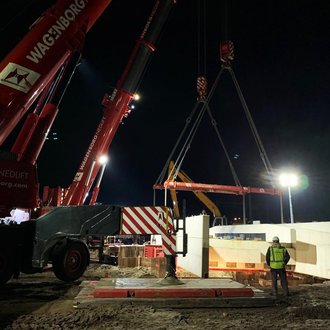 Zwei gewaltige Mobilkräne mit einer Hebekapazität von jeweils 500 Tonnen wurden nach Haren verbracht, um das circa 175 Tonnen schwere Gleisdeck auf das Fundament zu heben. Im Vorfeld dieser Tandemlift-Operation wurden bereits die notwendigen Engineering- und Vorbereitungsarbeiten sowie die notwendigen Besprechungen erledigt. Die Standpositionen für die Kräne wurden vorbereitet, und in Zusammenarbeit mit Gebr. Reimert wurde eine „Brückenkonstruktion“ entwickelt und angebracht, auf der die Kräne auf sichere Weise abgestempelt werden konnten. Um das Deck auf sichere Weise heben zu können, wurden unter dem Deck Stahlbalken angebracht, an denen die Hebeschlingen befestigt werden konnten.