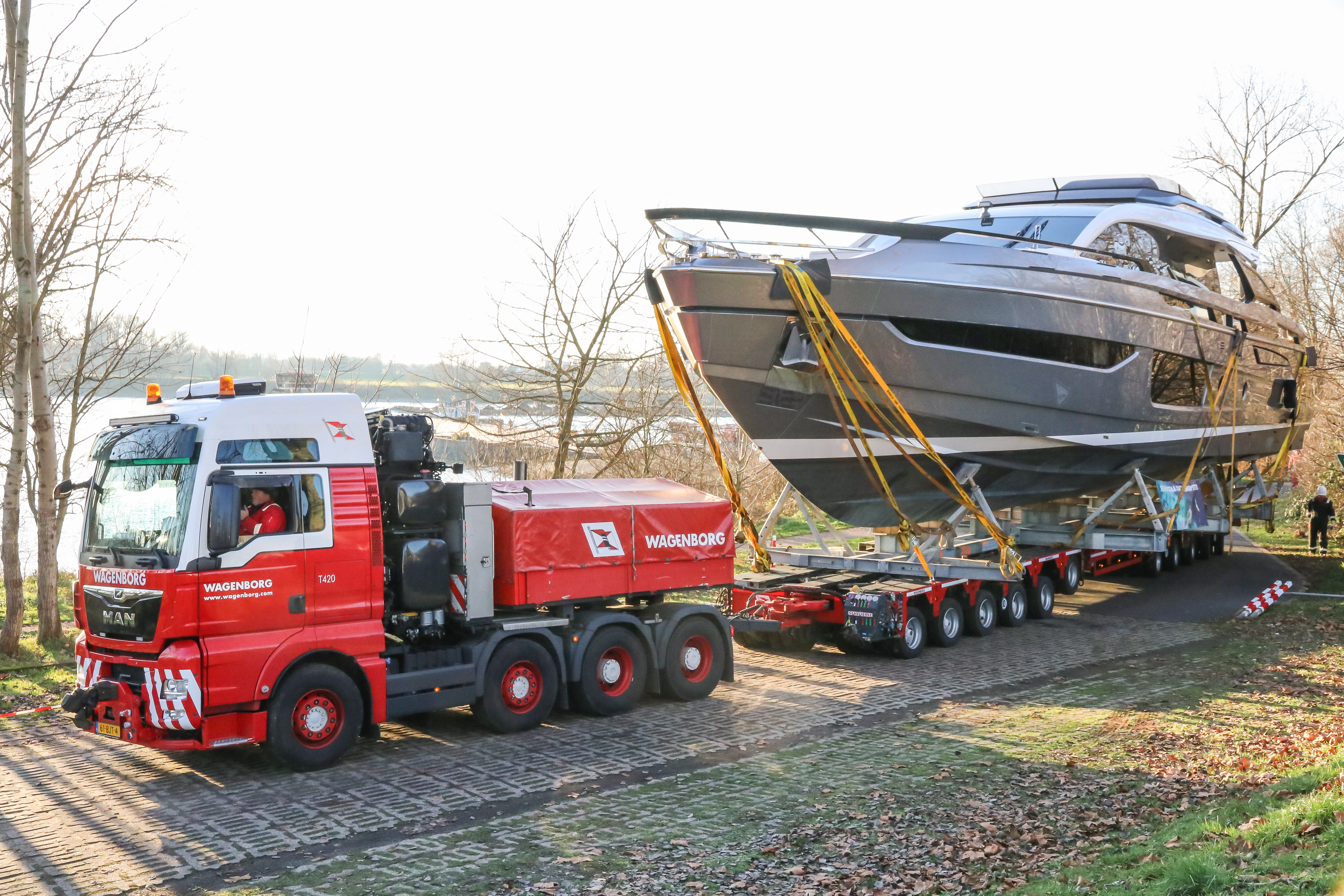 In Dordrecht haben wir die (noch) leeren Trailer auf Ponton gefahren, woraufhin der Transport auf dem Wasserweg nach Rotterdam begann. Hier haben wir die Yachten aus einem Hochseeschiff auf die Trailer auf dem Ponton geladen. Anschließend wurde die Fracht nach Düsseldorf gefahren, wo das RoRo stattfand und die Yachten in die Halle gefahren wurden.