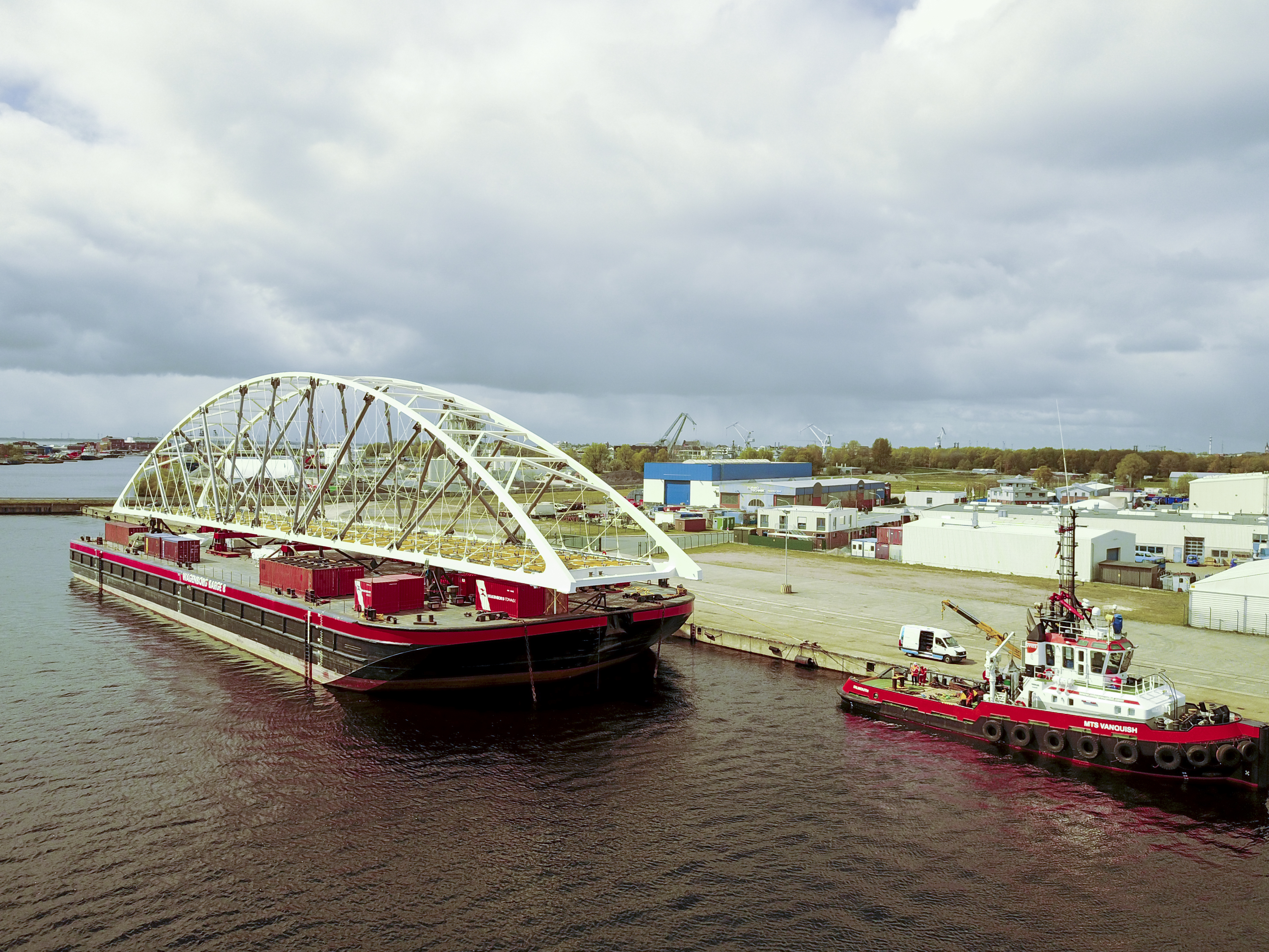 In der riesigen schneebedeckten Fjordlandschaft von Kirkenes fällt die große Stahlbogenkonstruktion sofort ins Auge. Die Brücke befindet sich immer noch auf den SPMT (Self Propelled Modular Trailers) auf der Wagenborg Barge 8. Langsam bewegt sich der Ponton zu den Betonsäulen, wo die Stahlbogenbrücke aus deutscher Fertigung platziert wird. An Bord beobachten Männer in Overalls genau, wie sich die 120 Meter lange Konstruktion den Fundamenten nähert; Walkie-Talkies in der Hand, um jeden Zentimeter Bewegung mit ihren Kollegen an Land zu kommunizieren. „Dies ist der Moment der Wahrheit", meint Marc Mazereeuw, Direktor von Wagenborg Towage. „Wir haben die Flut auf unserer Seite und die SPMTs haben die Brücke bereits um 90 Grad gedreht. Unser nächster Schritt ist es, dem Ponton Gegengewicht zu verleihen, um die Brücke langsam abzusenken. Dies wird ein großartiges Projekt für Wagenborg.“