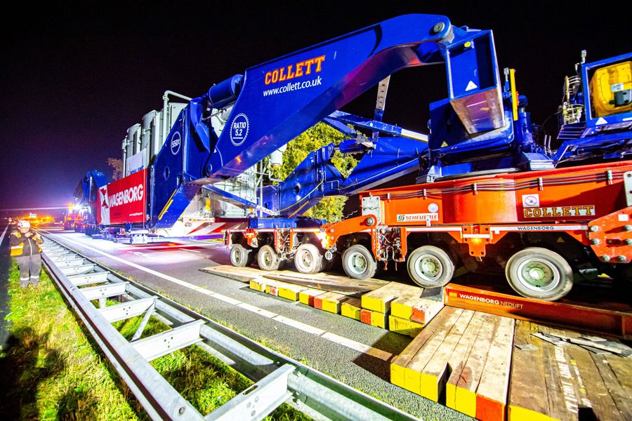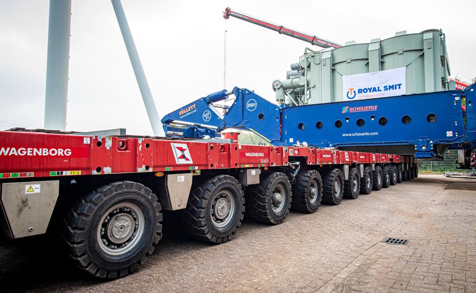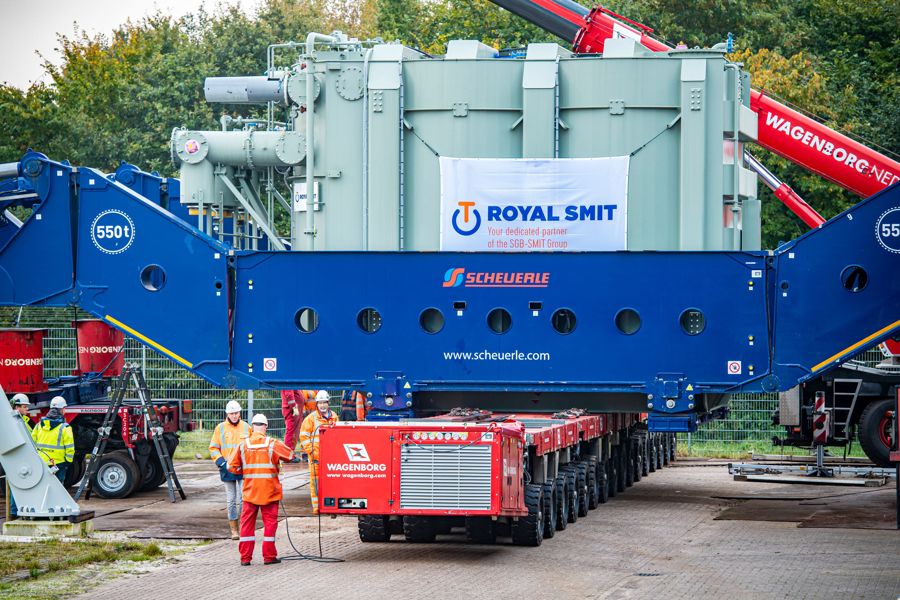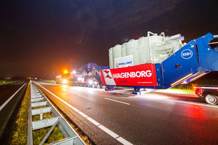 Über das Hubsystem des Girderbridge-Trailers wurde der Transformator angehoben, sodass ein SPMT-Trailer darunter passte. Nun konnte der SPMT-Trailer den Transformator übernehmen und zu den Fundamenten transportieren. Zum Schluss führten die Spezialisten von Wagenborg einen Hochschraub- und Verschubvorgang durch, um den Transformator auf das Fundament zu setzen.