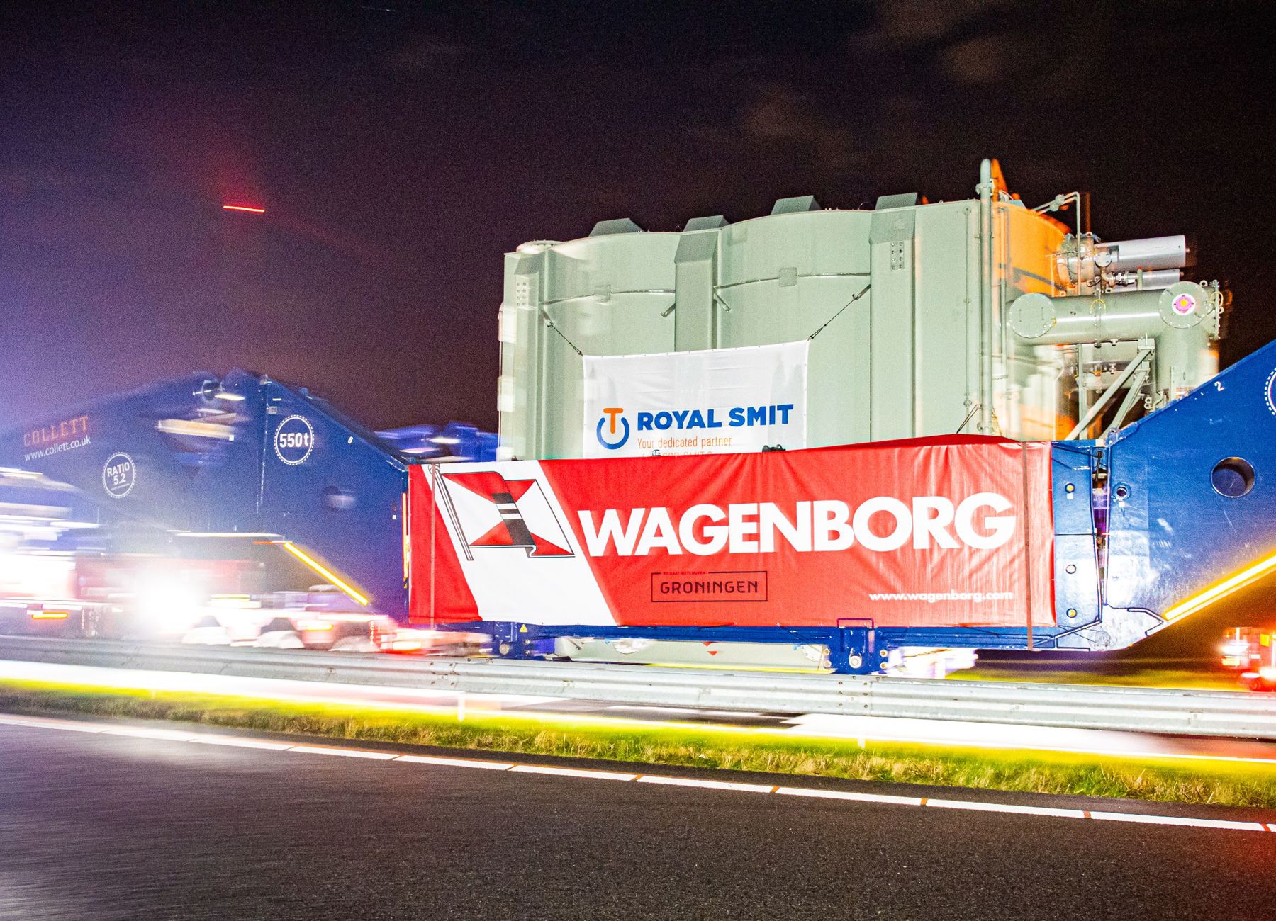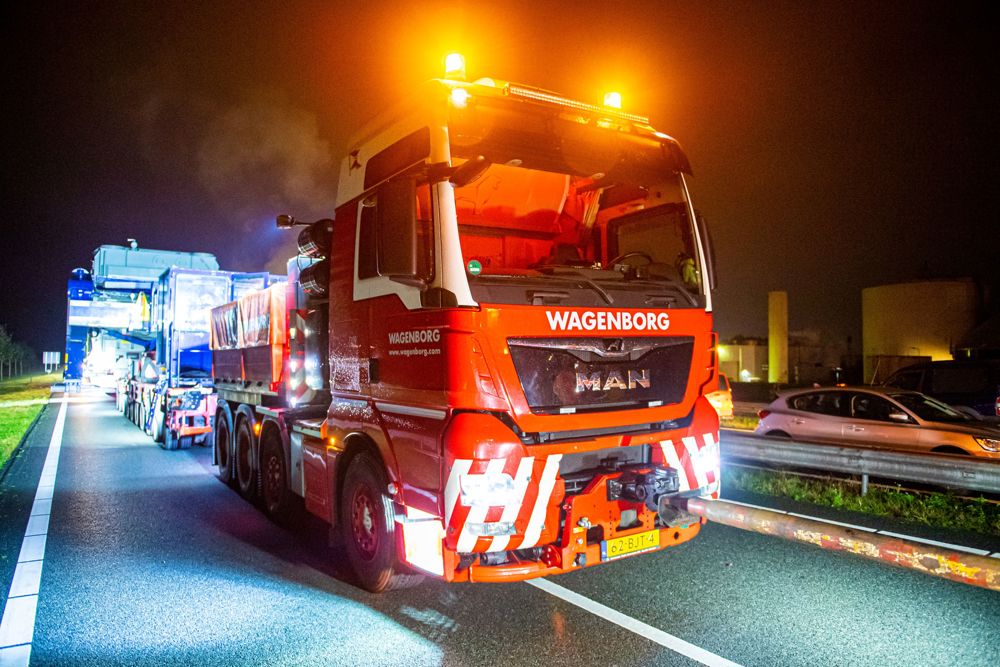Alle Vorbereitungen und Mühen waren nicht umsonst gewesen: Punkt 22.00 Uhr setzte sich die gigantische Transportkombination langsam in Bewegung. Über den speziell konstruierten Zugang manövrierte das Wagenborg-Transportteam den Koloss die gesperrte N33 entlang. Entgegen der Fahrtrichtung ging es über die Auffahrt und Ausfahrt 39 nordwärts zur Durchfahrt.