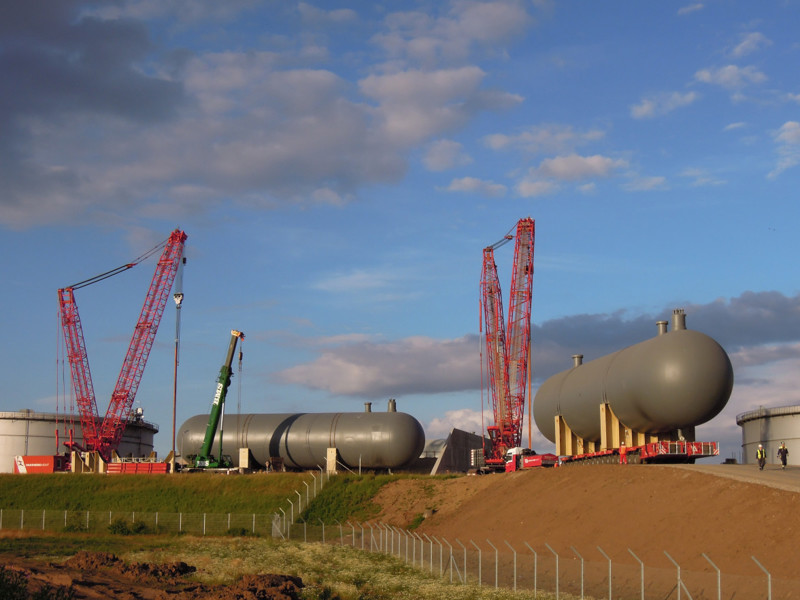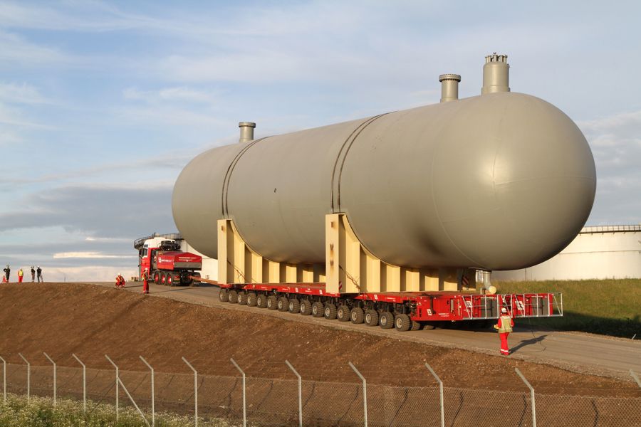 Die Erweiterung des Terminals in Fredericia umfasste den Bau von Gasverarbeitungsfabriken und Lagervorrichtungen für flüssiges Propan- und Butangas. Flüssiges Butan- und Propangas wird in acht riesengroßen horizontalen Tanks gelagert. Diese Tanks sind wahre Giganten! Nicht nur im Hinblick auf ihr Gewicht (325,5 Tonnen inklusive der Transportsättel), sondern auch im Hinblick auf ihre Ausmaße. Die in Willebroek (Belgien) hergestellten 38,54 Meter langen Tanks haben einen Durchmesser von 8,43 Metern und ein Fassungsvermögen von 1.850 m³.