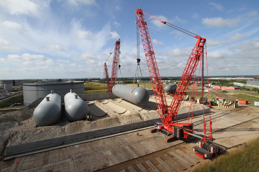 Für die allerletzte Phase des Projekts, das Abstellen der Riesentanks auf dem Fundament, setzte Wagenborg Nedlift zwei seiner größten Raupenkräne ein, um einen Tandemlift auszuführen. Der 400-Tonnen Liebherr LR1400 Raupenkran und der 350-Tonnen Demag CC2200 waren beide mit Hauptmast und Superlift-Ballast ausgestattet und besaßen dadurch hinreichende Kapazität, um die Riesen sicher im Sandbett abzusetzen.