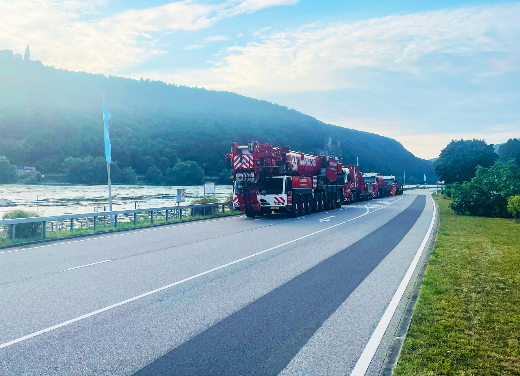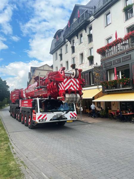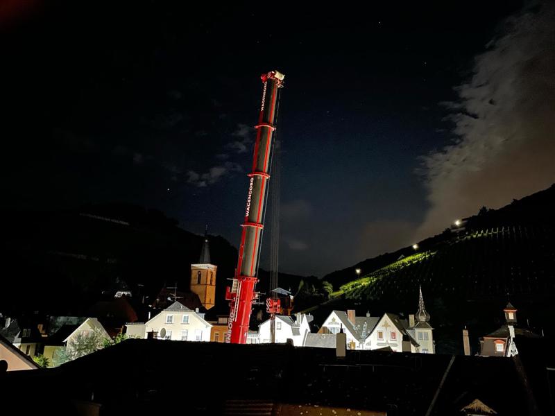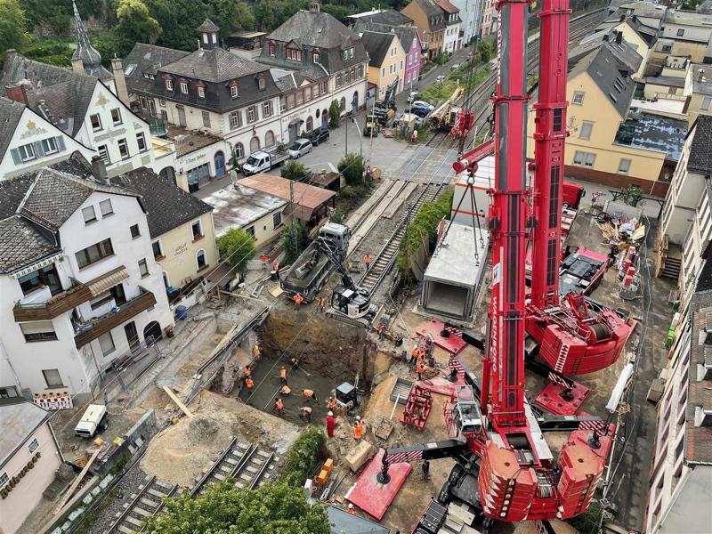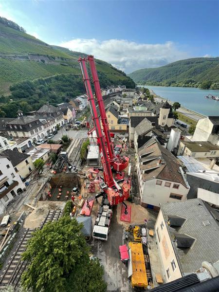 The pedestrian tunnel runs under the railway track between Rüdesheim and Koblenz, parallel to the B42 and the Rhine. This track runs straight through Assmannshausen, which meant that there was very little space for the mobile cranes. Getting to the construction site (manoeuvring between the characteristic houses) also required professional steering skills. Assembly of the cranes also presented a challenge: the cranes could only be assembled one after the other and the first crane was required to erect the second crane. In short: an interesting challenge in a tight space.