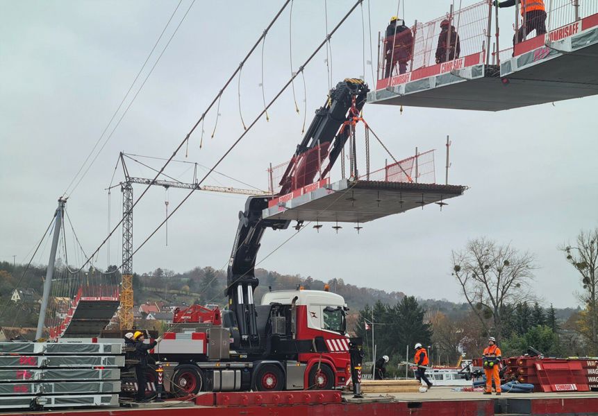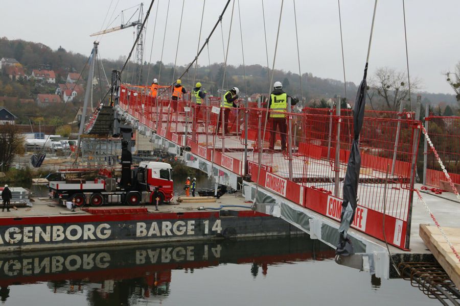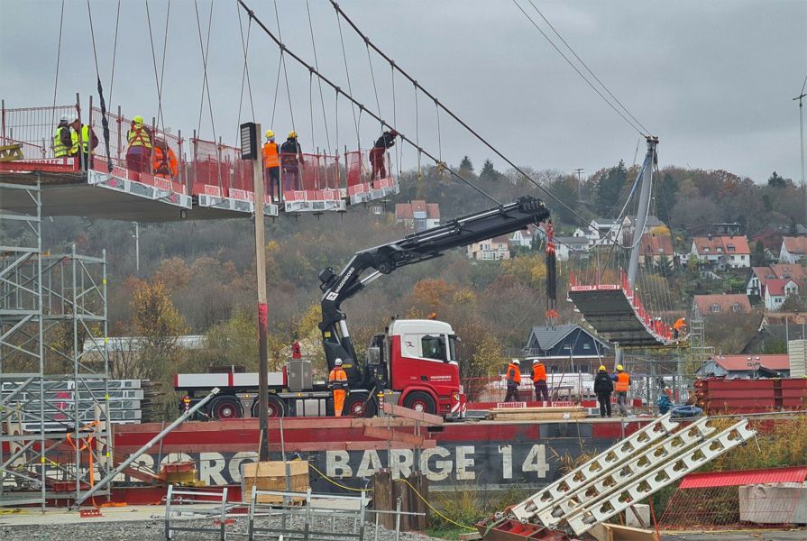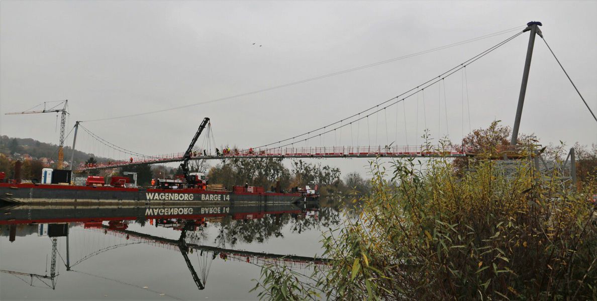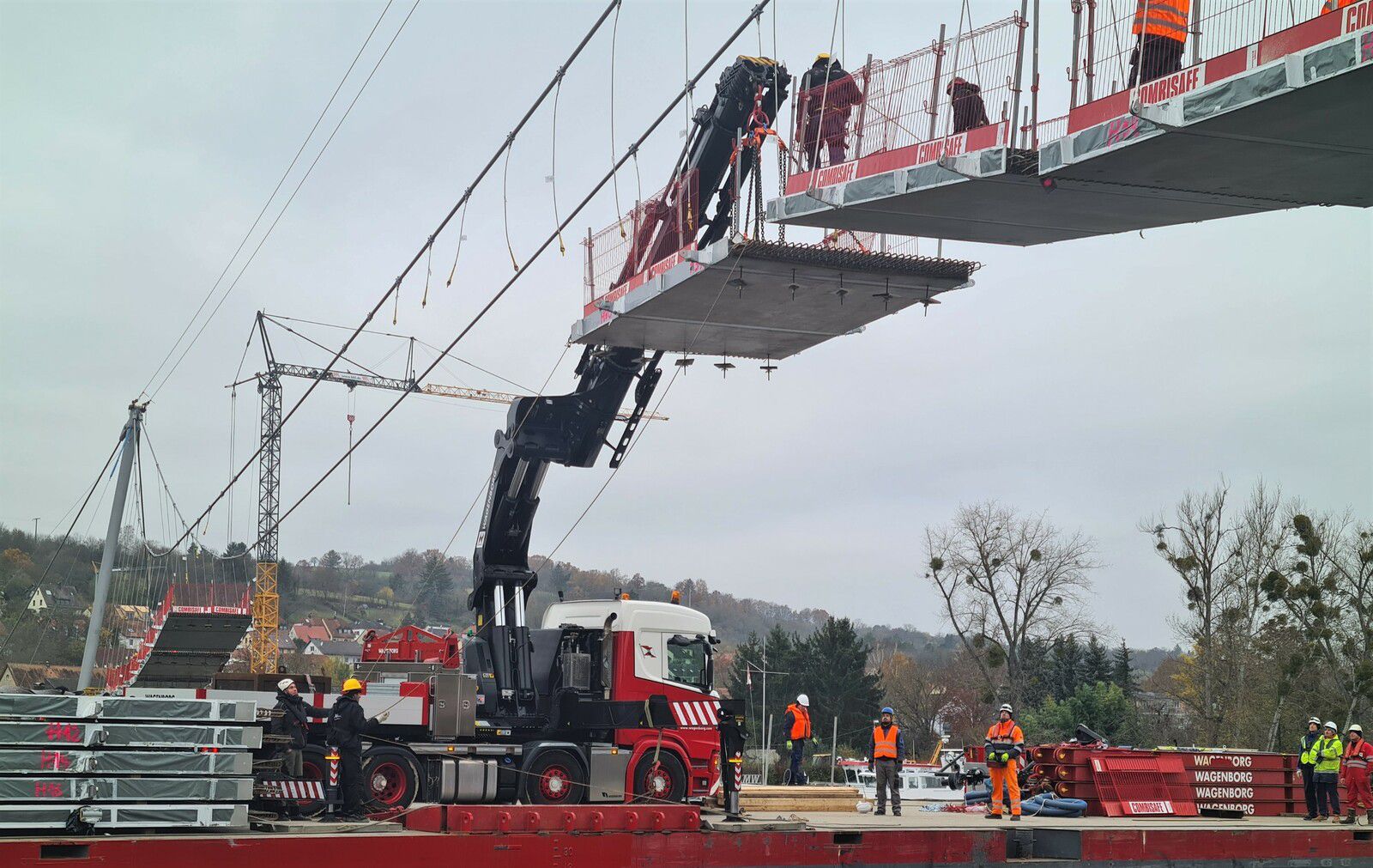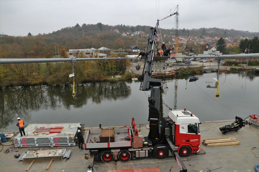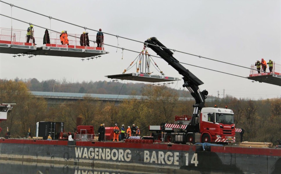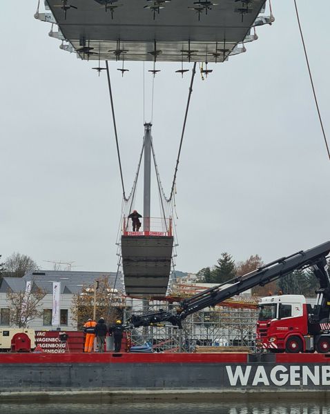 The construction of the new suspension bridge proved to be quite a challenge. The pylons on the banks were placed and assembled in sections without any problems. But to hoist 11-tonne pre-fabricated sections at a distance of over 60 metres, you need heavy lifting equipment. For which there was no room on the banks.