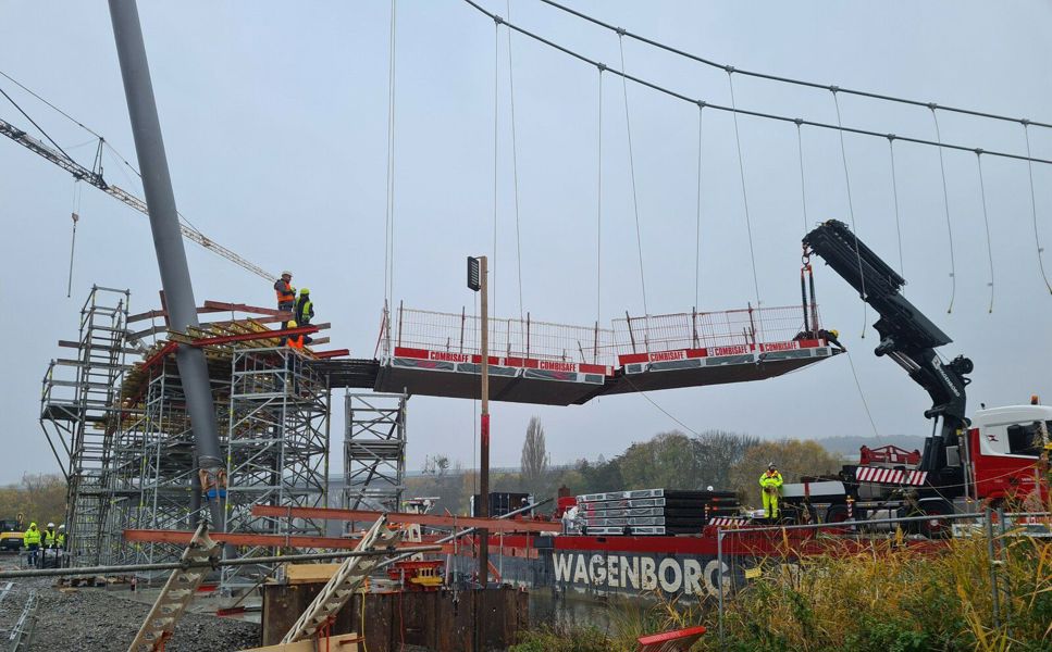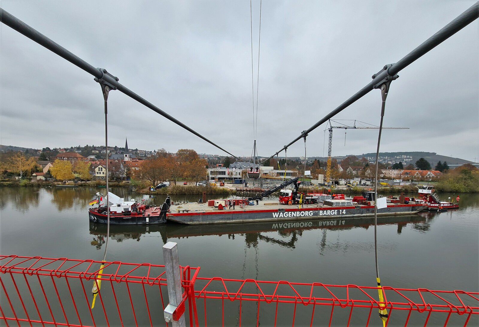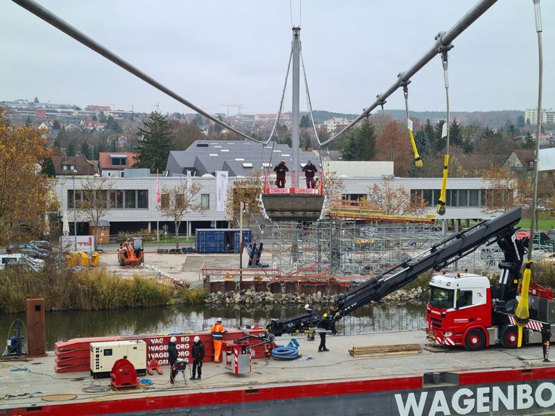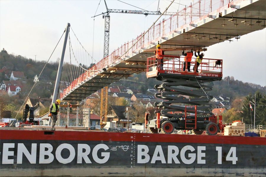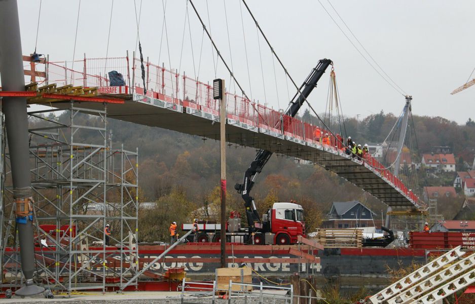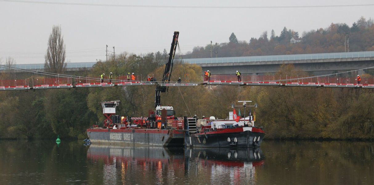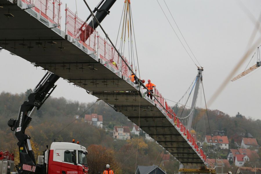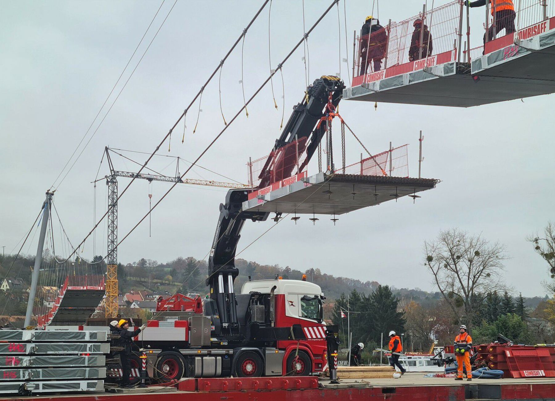 The construction of the new suspension bridge proved to be quite a challenge. The pylons on the banks were placed and assembled in sections without any problems. But to hoist 11-tonne pre-fabricated sections at a distance of over 60 metres, you need heavy lifting equipment. For which there was no room on the banks.