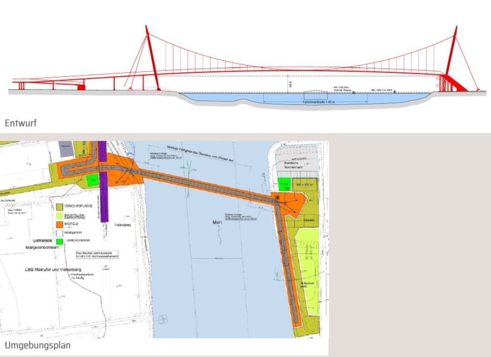 The new suspension bridge has a futuristic design and a free span measuring at an impressive 122 metres. The bridge is supported by two heavy guy wires connected to pylons located on both sides of the Main River.