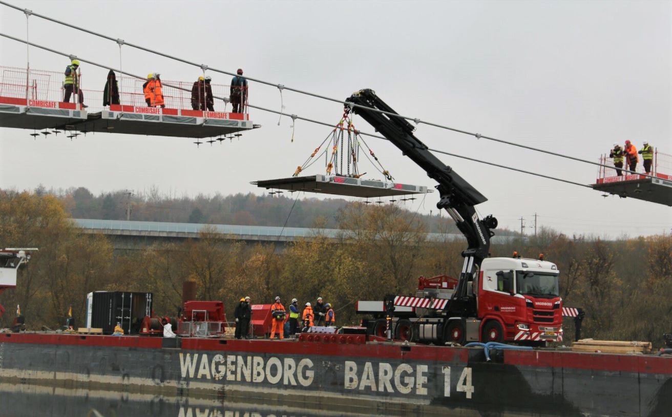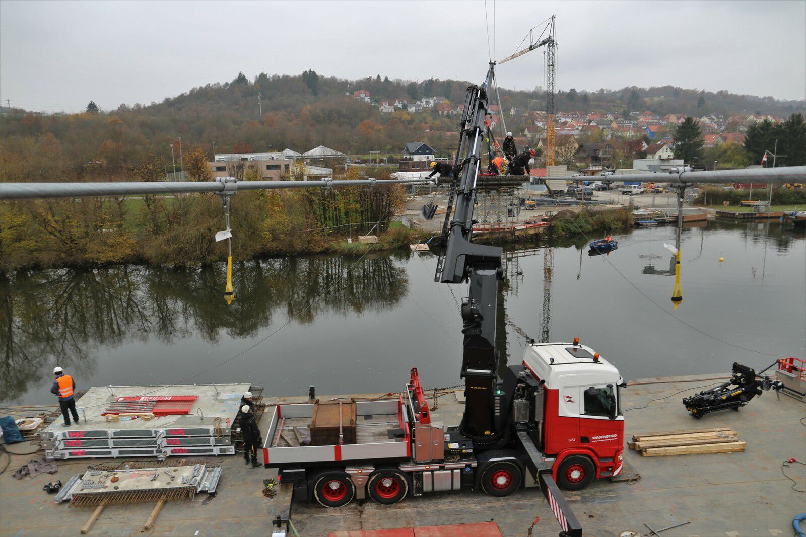 What followed was fantastic teamwork between the water transportation specialists, who made sure the pontoon stayed in the right position, and the lifting specialists of the knuckle boom crane, who placed the pre-fabricated sections one by one in the guy wires.