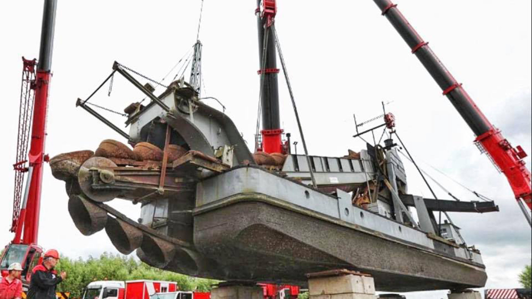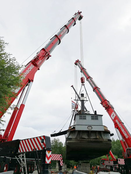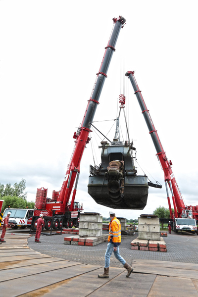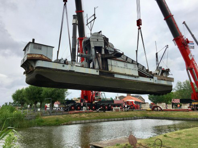 On Thursday 4 June, Wagenborg Nedlift hoisted the last coal-fired bucket dredger in the Netherlands, called 'Vooruit', from the museum harbour onto the car park of the Dutch Steam Engine Museum in Medemblik (NL). A large-scale maintenance operation is scheduled for the dredger.