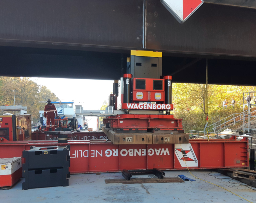This jacking system was only recently commissioned by Wagenborg Nedlift. The Fahlenbergbrücke project is therefore one of the first projects for this latest asset in jacking technology. The new jacking system uses jacking elements, is equipped with the latest features in jacking technology and is computer-controlled. A perfect system, therefore, for jacking a bridge like the Fahlenberg Bridge.
